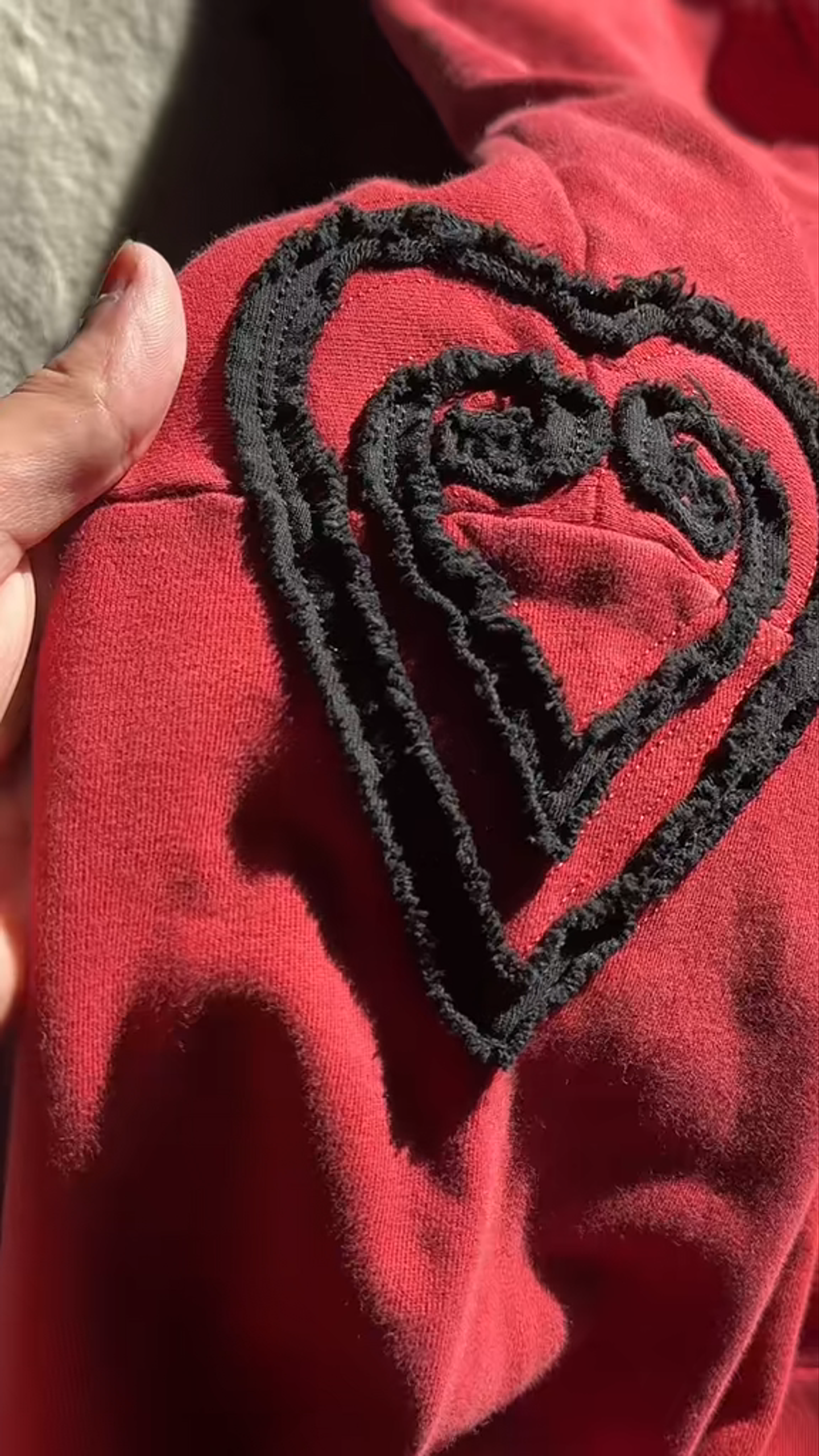 Appliqué distressed embroidered patches across front, back, and sleeves