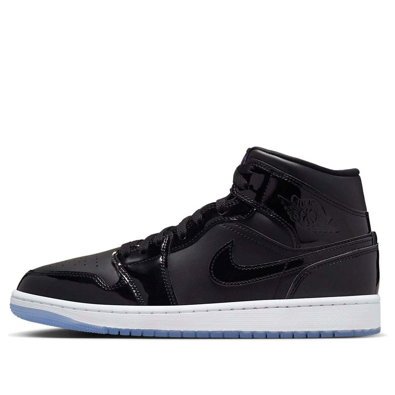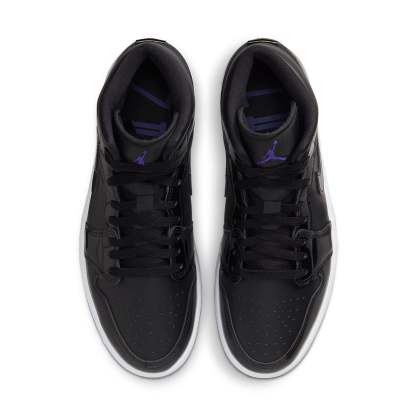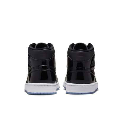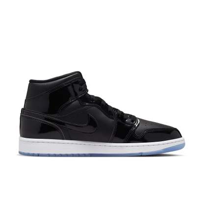 The Air Jordan 1 Mid SE 'Space Jam' is a stylish sneaker that features a black leather base, patent leather overlays, and a mesh tongue. The dark Concord tongue branding and insole are complemented by a white midsole and a dark, semi-translucent outsole. Perfect for any activity, this sneaker is inspired by the classic 'Space Jam' movie and is part of the Air Jordan 1 series. With its sleek design and comfortable fit, this sneaker is sure to be a favorite.