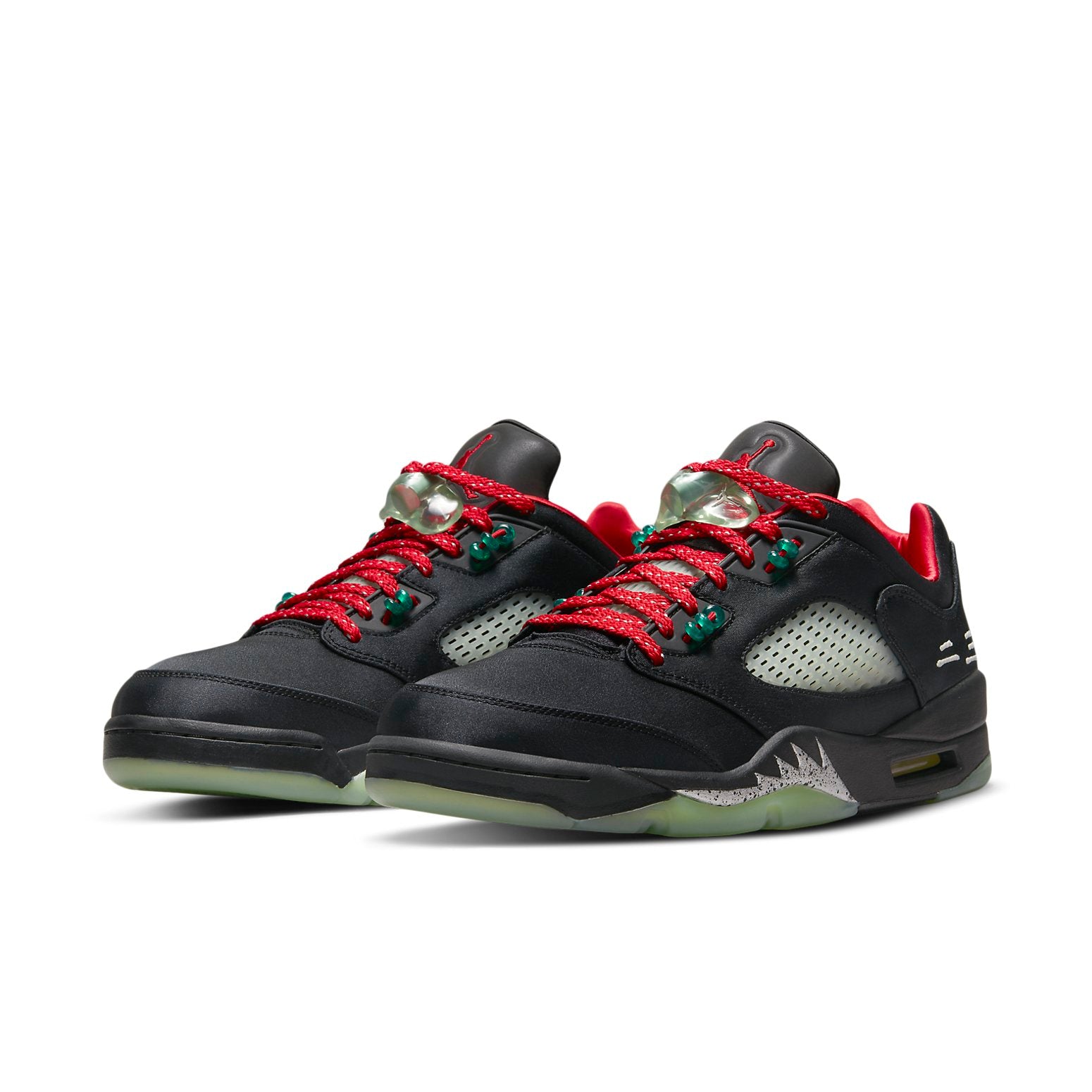 The CLOT x Air Jordan 5 Retro Low 'Jade' is a stylish sneaker with a sleek silhouette. Featuring a black suede upper, reflective tongue and a crystal-clear rubber sole, this sneaker is perfect for any activity. The inspiration behind the design is Chinese traditional jade jewelry, with red and green accents and a unique "Suzhou Code" at the heel. This sneaker is the perfect combination of modern style and Chinese culture, making it a must-have for any sneaker collection. Release date: 2022-05-13.