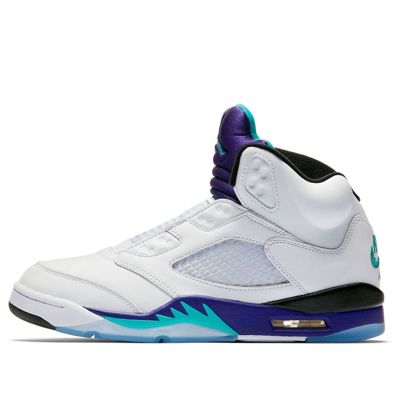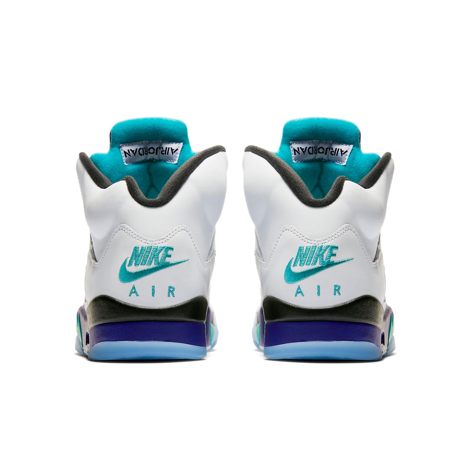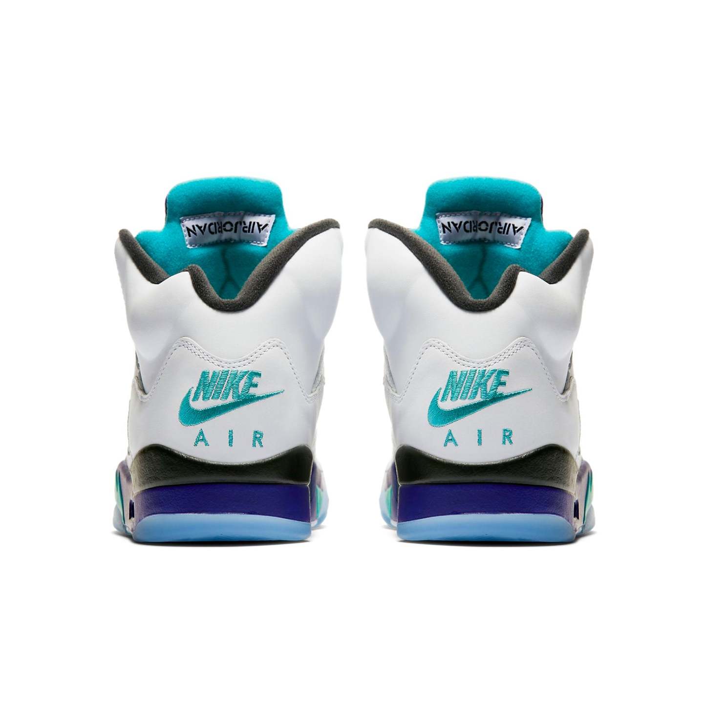 The Air Jordan 5 Retro NRG 'Fresh Prince' is a special edition sneaker released in celebration of Will Smith's 50th birthday. The sneaker is inspired by the laceless AJ5 model that Smith wore on the set of The Fresh Prince of Bel-Air, and features a vibrant Grape Ice and New Emerald colorway. The design also includes a nod to the show's title sequence graffiti on the insole.