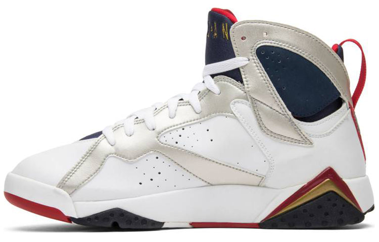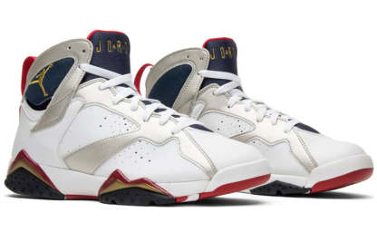 The Air Jordan 7 Retro 'Olympic' is back for 2012, and it's better than ever. This iconic sneaker was originally released in 1992, and it was worn by Michael Jordan as he led the USA "Dream Team" to a gold medal at the Olympic Games. The design features a white and metallic silver upper with accents from Obsidian, metallic gold, and True Red. The sneaker was released in July 2012 and includes the Olympic Jersey number '9' on the heel. If you're a fan of MJ or the USA Dream Team, this is a must-have sneaker for your collection.