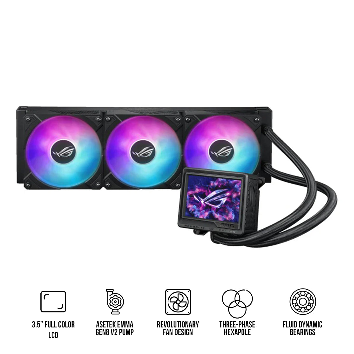 Experience exceptional performance with the ROG Ryujin III 360 ARGB Extreme, featuring Asetek’s Emma Gen8 V2 pump and enhanced magnetic ROG ARGB fans to maximize the power of AMD AM5 9000 Series and Intel® Core™ Ultra Processors. This advanced cooling solution includes an embedded VRM fan for stable performance during intense tasks. With an upgraded LCD offering 480p resolution and 60Hz refresh rate, enjoy a smoother visual experience—unlock limitless possibilities with the ROG Ryujin III 360 ARGB Extreme!