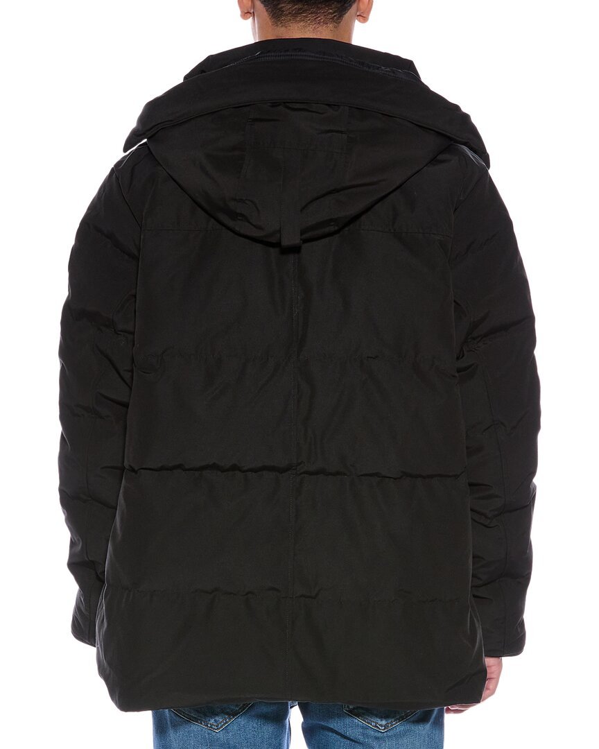 Introducing the Canada Goose Wyndham Parka in black, a functional and stylish outerwear option for the modern adventurer. This quilted parka features a removable hood, two front zippered pockets, a patch logo at the sleeve, and ribbed inner cuffs for added warmth. Measuring approximately 30 inches from shoulder to hem, this parka is designed to provide both style and practicality. The model is 6'3 and is wearing a size large, but please note that measurements may vary slightly by size.Crafted with a durable shell of 84% polyester and 16% cotton, a lining of 100% polyamide, and fill of 80% duck down and 20% feather, this parka is heavyweight and built to withstand the elements. With zipper and snap closures, this parka is easy to put on and take off, making it the ideal choice for cold weather. It is recommended to dry clean only to maintain its quality.Proudly made in Canada, this Canada Goose Wyndham Parka is 100% genuine. While some merchandise may be purchased from trusted independent suppliers, we stand by the authenticity of every product sold on our site. Choose Canada Goose for function-first apparel with a nod to adventure.