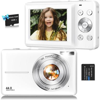 Digital Camera,FHD 1080P Camera 44MP Point and Shoot Digital Cameras with 32GB Card,16X Zoom,Anti-Shake,Date ,Compact Small Cameras Photography for Student Teen Girl Boy(White)