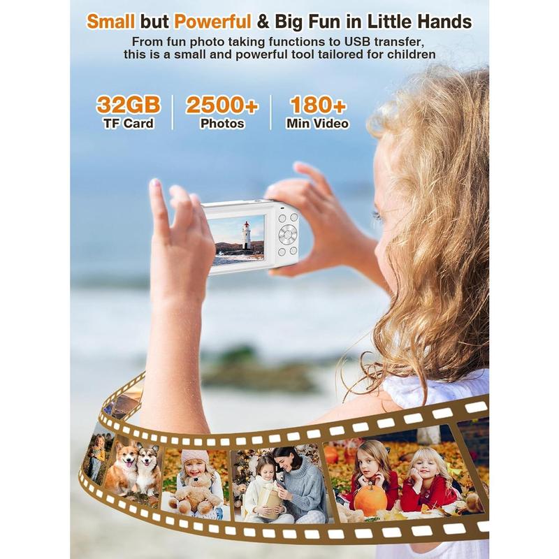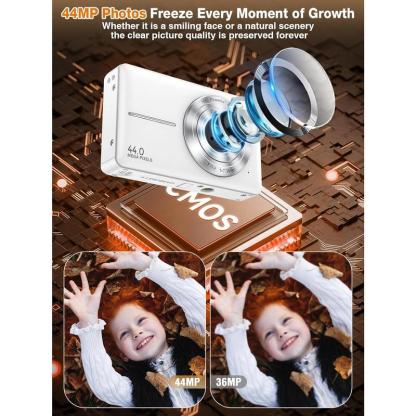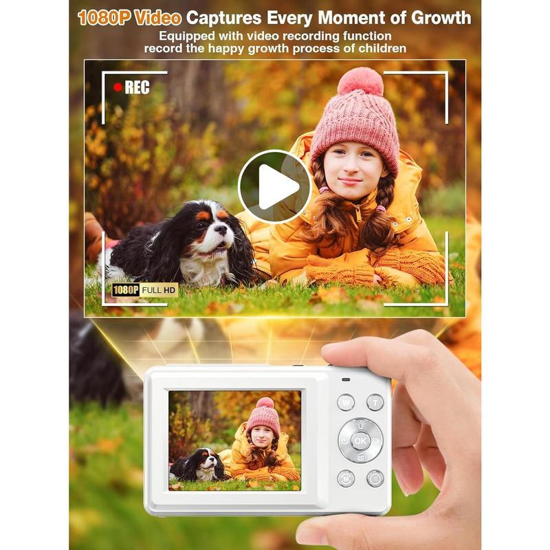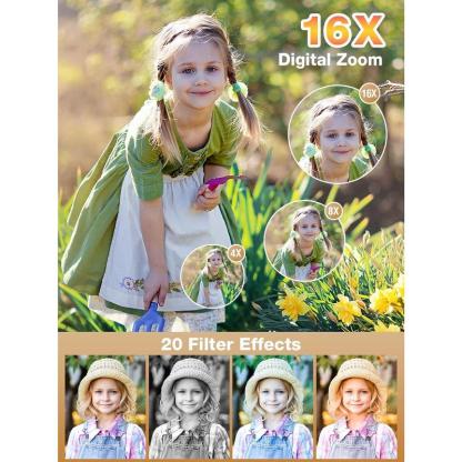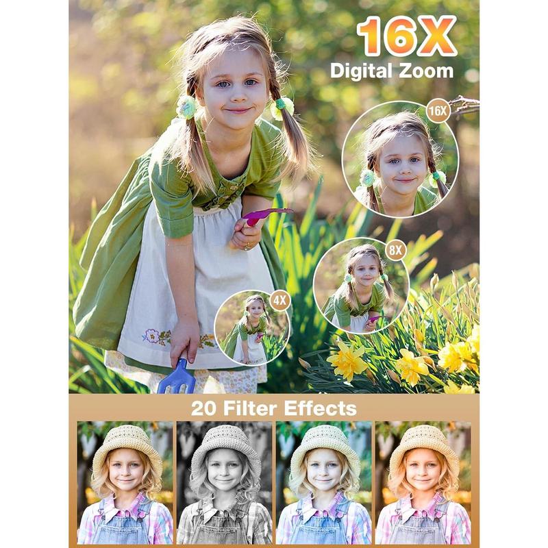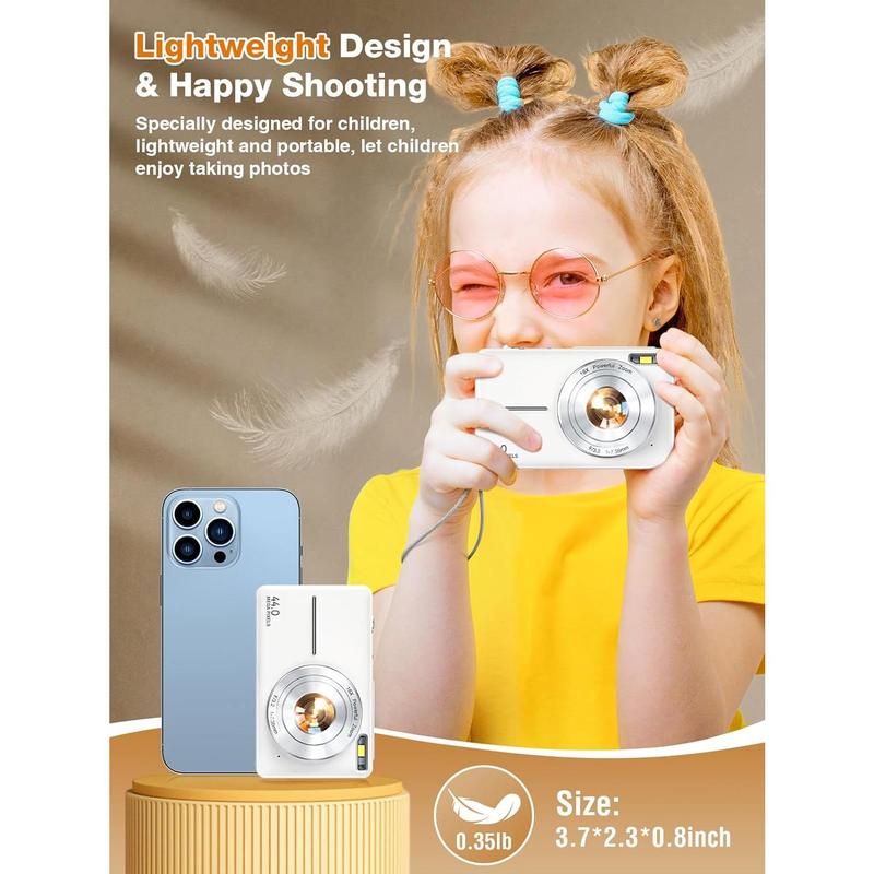 【1080P Video & 44MP Photos – Record Every Moment of Childhood】 Give your their first camera! This high-quality digital camera supports 44MP photos and 1080P video recording, allowing to capture every wonderful moment clearly. 16x digital zoom helps zoom in on distant scenery, shoot birds, pets, and even at night, inspiring their spirit of exploration. 【20 Fun Filters & Fun Modes】 Built-in 20 creative filters, including retro, black and white, warm colors, etc., allowing to create their own photography works. Whether taking photos with at a birthday party or taking cool costumes on Halloween, the built-in smile detection and recognition functions can easily freeze happy moments. The built-in flash ensures bright photos at night, for various lighting environments. 【Lightweight and Portable & Travel-Friendly】 This small digital camera is than a mobile phone! Only 0.35 pounds, with a non-slip wrist strap, easy to carry with you. The 2.4-inch IPS screen provides a high-definition display while protecting your 's eyes. This compact camera can be for 150 minutes on a single charge, so you don't have to worry about running out of power on the way, so that your can record the wonderful moments of the journey at any time. 【Video Vlog & Webcam Mode】 Is your dreaming of becoming a photographer? This point and shoot digital camera has a built-in microphone and supports video recording, which can be to shoot daily life, pet interactions, or family vacation vlogs. After connecting to a computer, the camera can also be as a webcam for video calls or remote learning, allowing to stay connected with the world! 【 & Full Accessories】 This photography camera is an ideal for , suitable for important moments such as birthdays and holidays. The set includes a 32GB TF card, rechargeable , Type-C , adapter, and wrist strap, and is ready to use out of the box. We provide 24/7 customer service support to ensure that every little photographer can a pleasant experience!