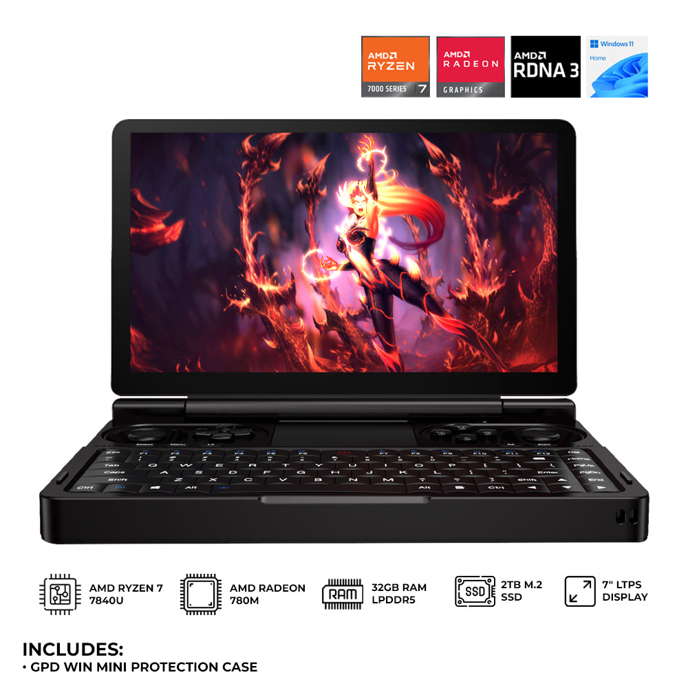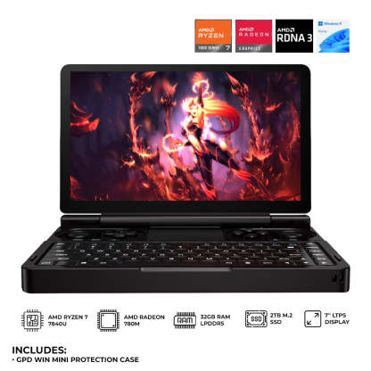GPD Win Mini AMD Ryzen 7 7840U 7" LTPS Technology 120Hz 32GB RAM + 2TB SSD Windows 11 Clamshell Handheld Gaming Console + GPD Win Mini Protective Case