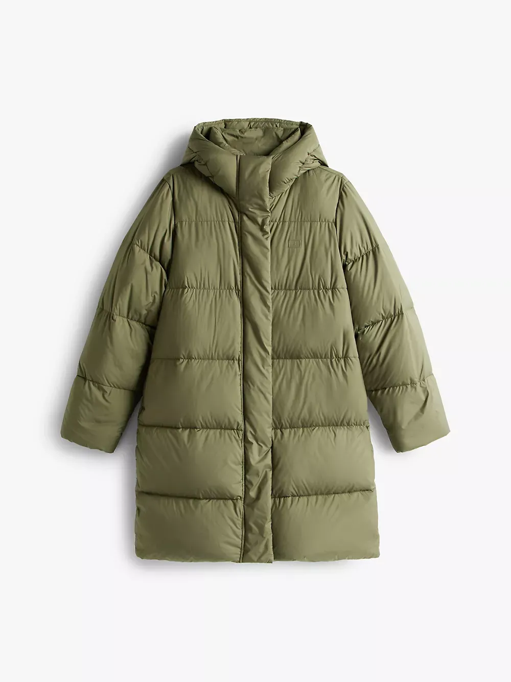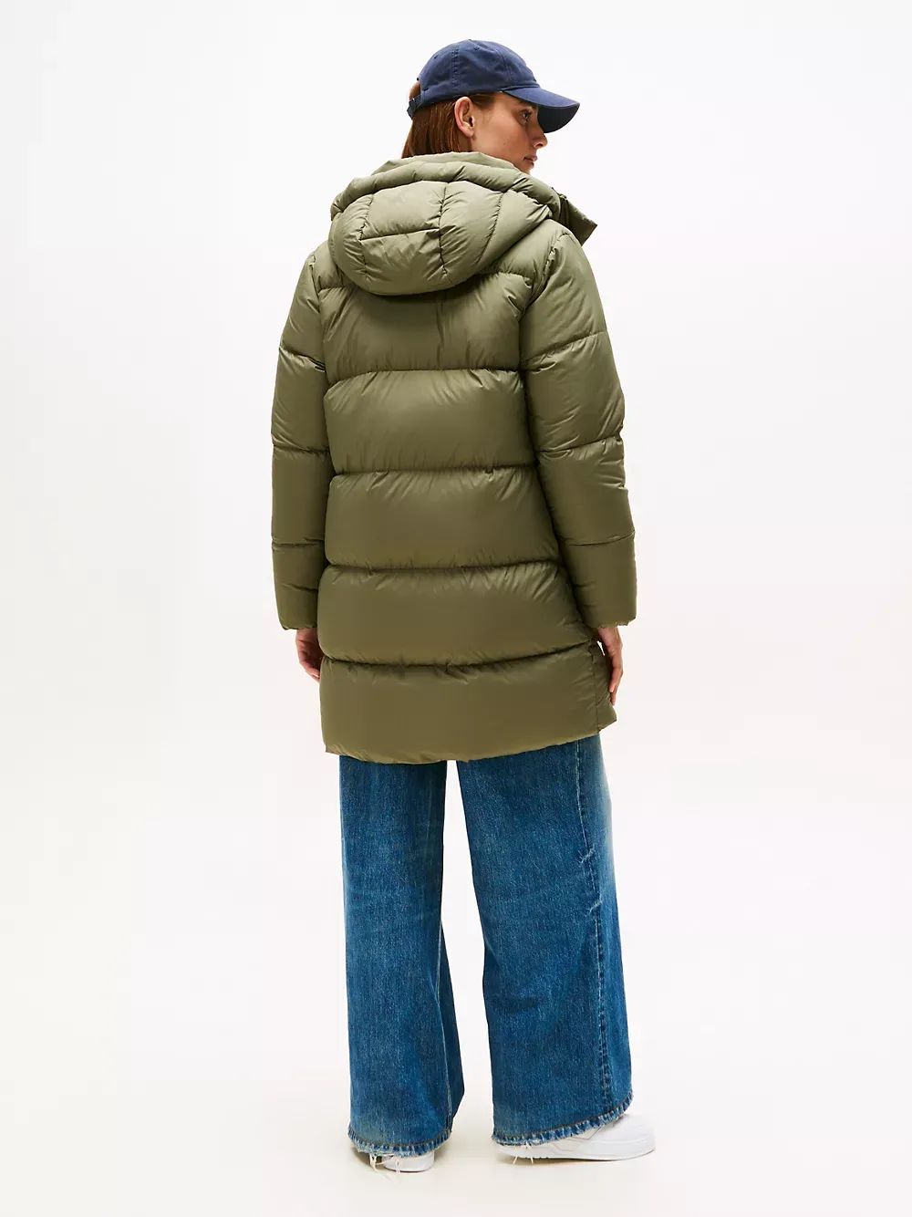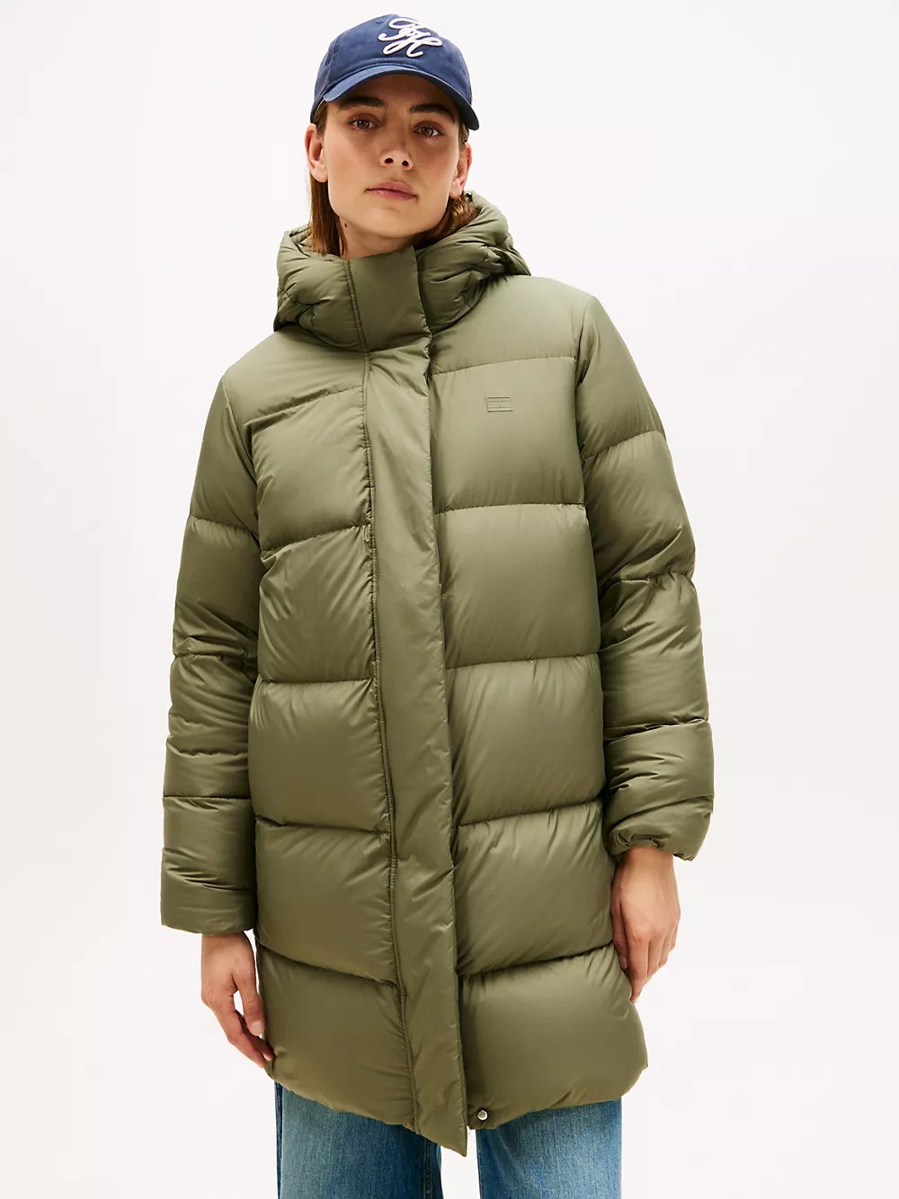 Tommy Hilfiger women's coat. Heritage style meets contemporary construction in this puffer coat, made chill-proof thanks to the down insulation, a high funnel neck and a fixed hood. This iteration is designed in a midi silhouette, intended to finish close to the top of the knee.