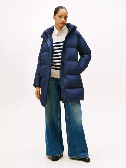 Tommy Hilfiger women's coat. Heritage style meets contemporary construction in this puffer coat, made chill-proof thanks to the down insulation, a high funnel neck and a fixed hood. This iteration is designed in a midi silhouette, intended to finish close to the top of the knee.