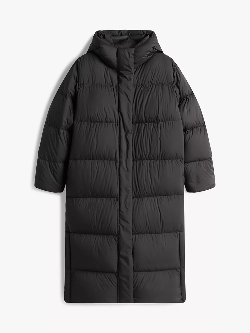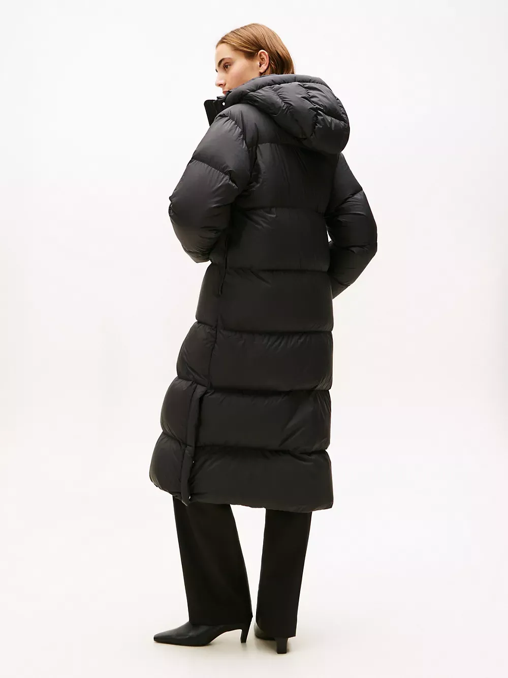 Tommy Hilfiger women's coat. Heritage style meets contemporary construction with this puffer coat, made chill-proof thanks to the down insulation, a high funnel neck and a fixed hood. This iteration is designed in a longline silhouette, intended to finish between the calf and the ankle.
