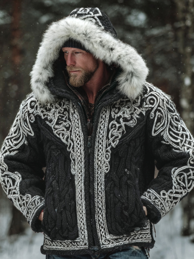 Men's Christmas Santa Celtic Art Warm Hooded Knit Sweater Jacket