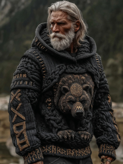 Men's Viking Brown Bear Pattern Jacquard Knitted Hooded Sweater