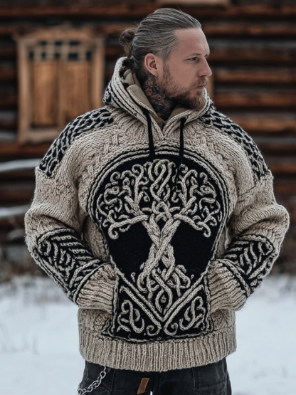 Men's Viking Style Tree Of Life Thick Needle Warm Hooded Sweater