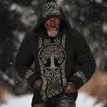 Men's Viking Style Tree Of Life White Thick Needle Hooded Sweater