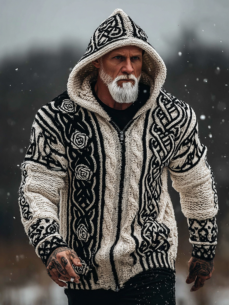 Men's Viking Tribal Jacquard Celtic With Rose Inspired Chunky Knit Zipped Hooded Sweater
