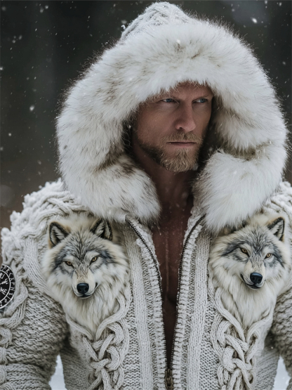 Men's Viking Vegvisir Wolves Celtic Cozy Fur Trim Hooded Cardigan