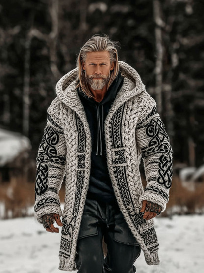 Men's Vintage Viking Celtic Knot Art Chunky Knit Mid-length Hooded Cardigan Sweater