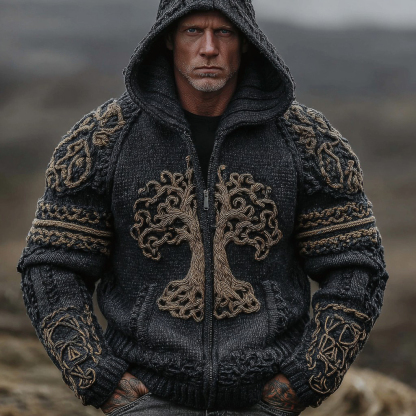 Men's Vintage Viking Life Of Tree Jacquard Knit Zipper Aran Sweater Hooded Cardigan
