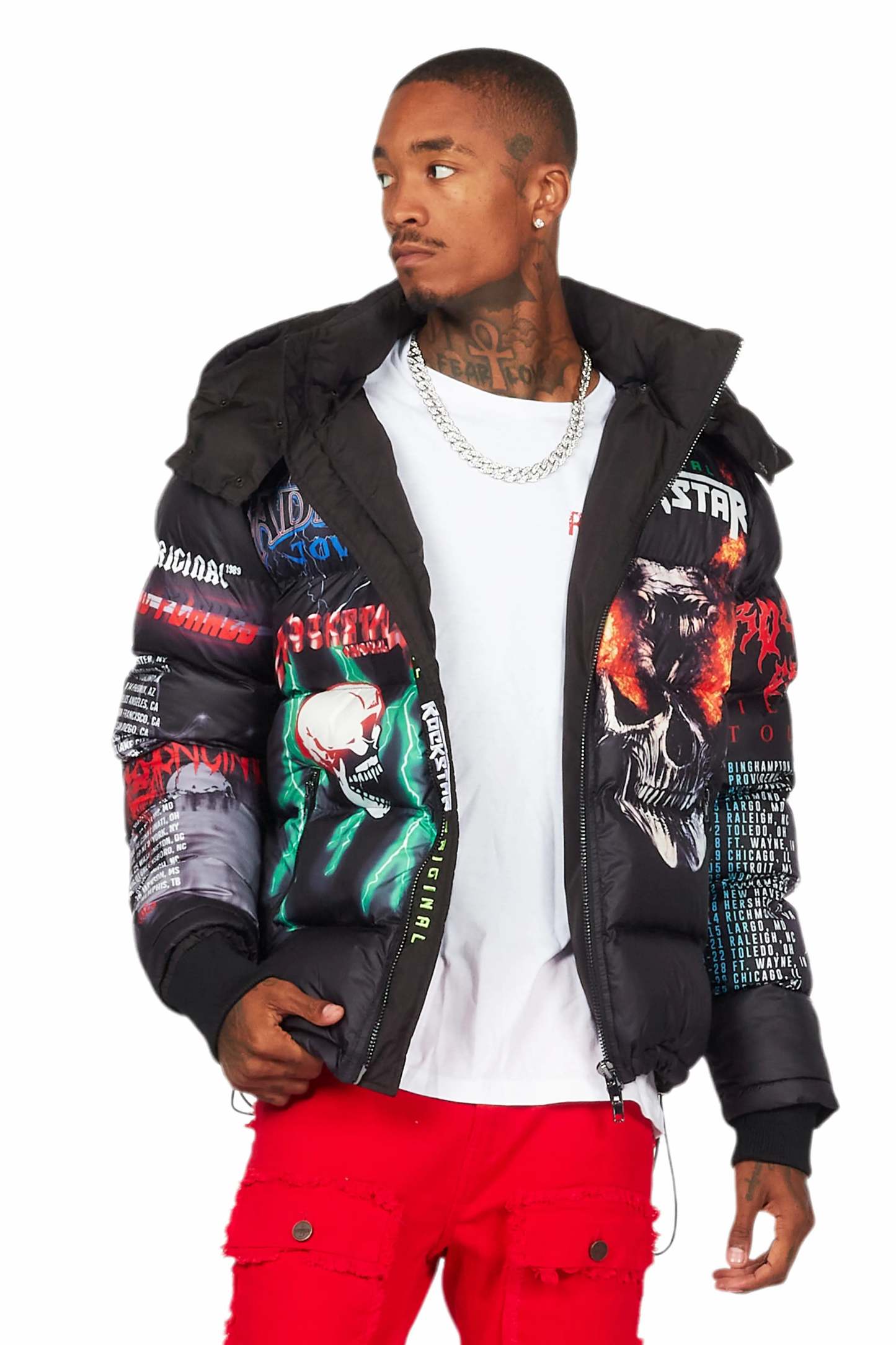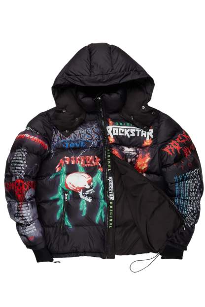 An urban streetwear puffer jacket for men in black. Designed with highest-quality insulated fabric and water and wind-resistant materials for a must-cop outerwear style.