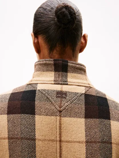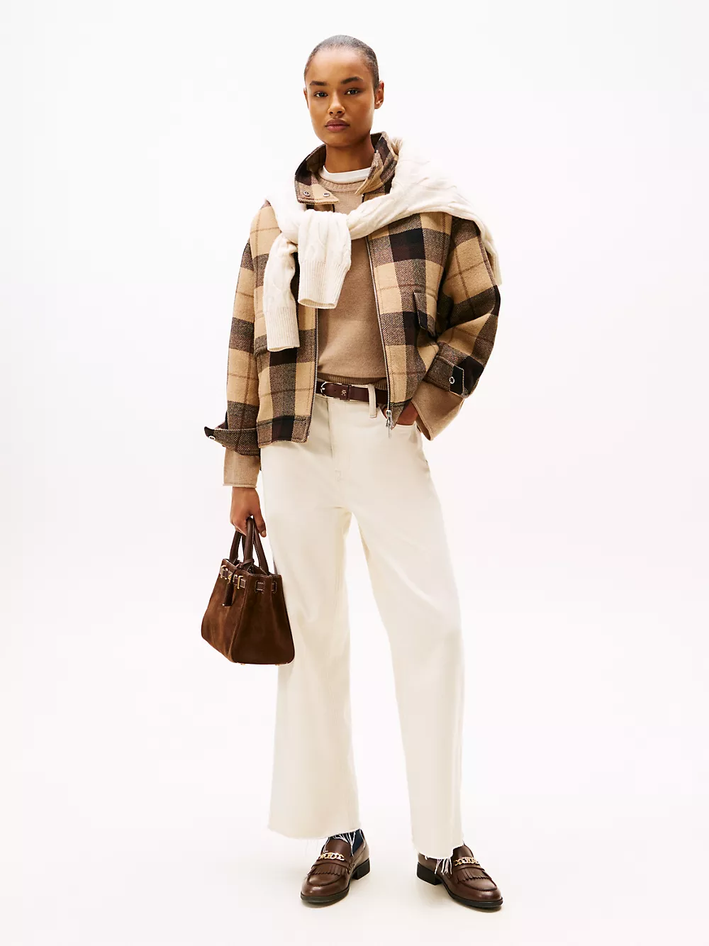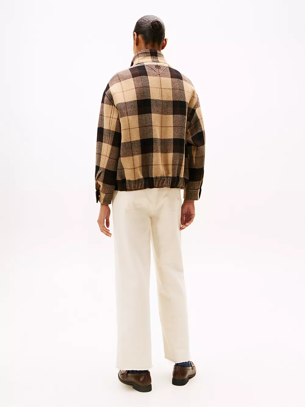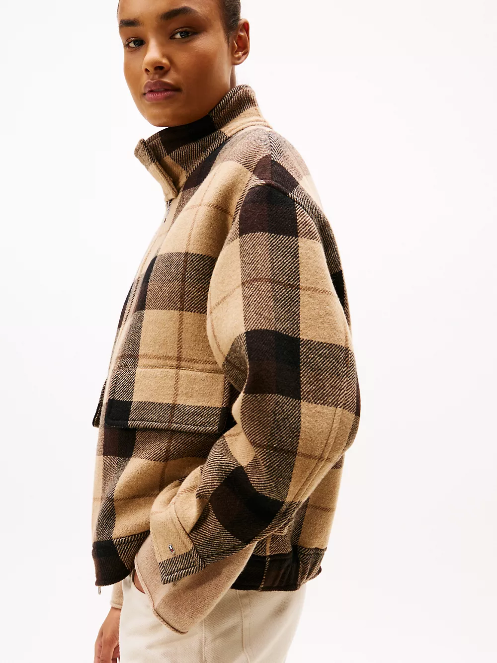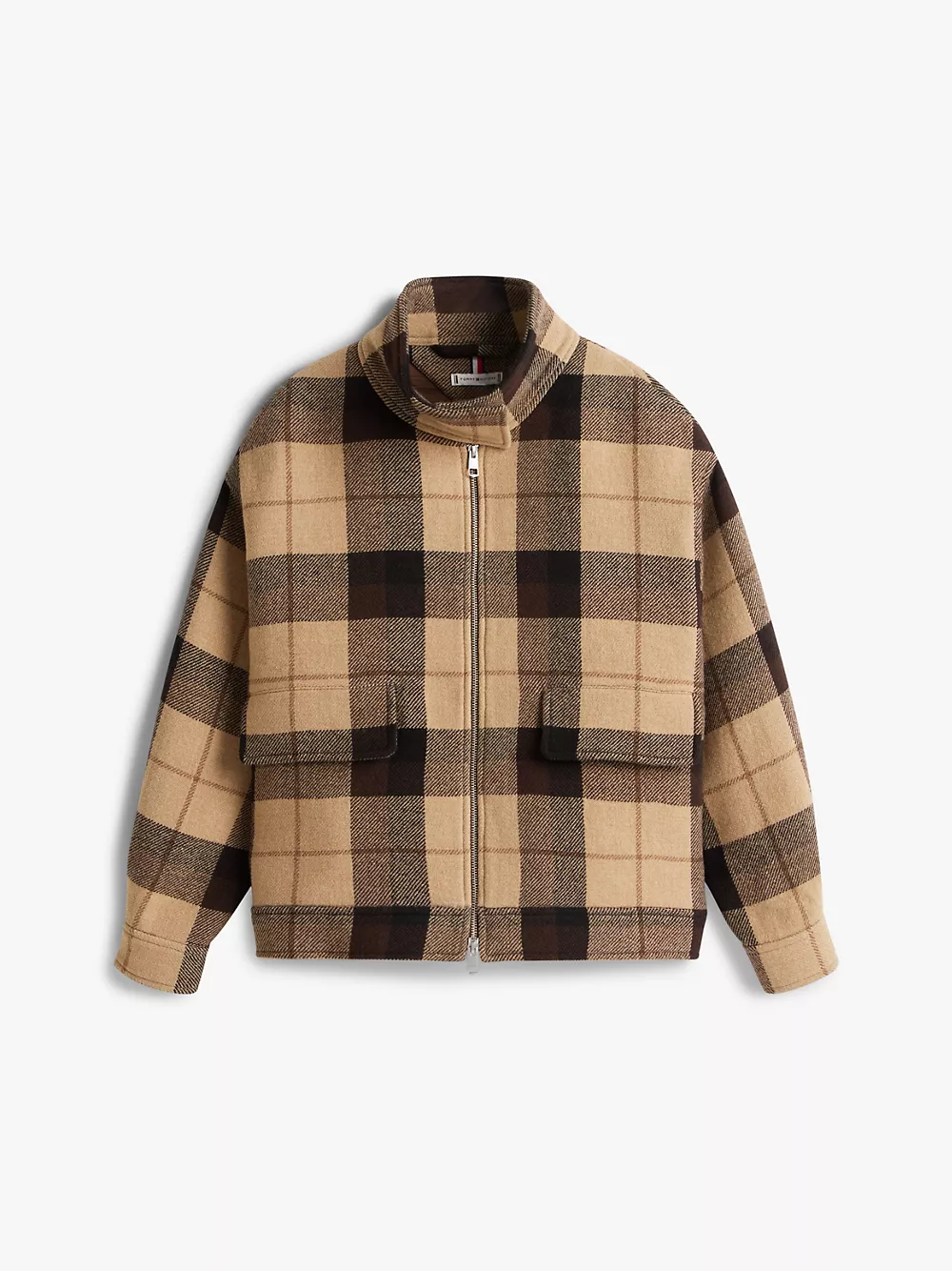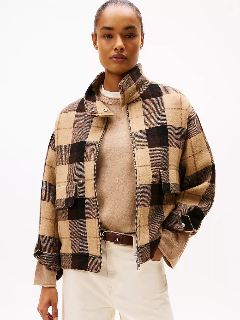 Tommy Hilfiger women's jacket. Stand out from the sea of black outerwear with our bold plaid print jacket made from a wool-cashmere blend for extra softness. It's cut with a comfortably relaxed fit and finished with large flap pockets and handy side pockets.