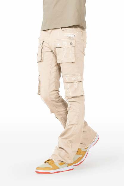 An urban cargo stacked flare jean for men in beige. Designed with organic cotton and extra long legs for a dope denim streetwear style.