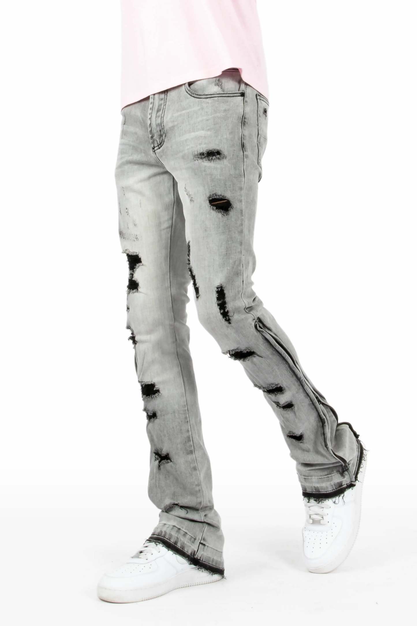 A distressed urban stacked denim jean for men in grey. Designed with organic cotton and frayed rips for a dope streetwear style.