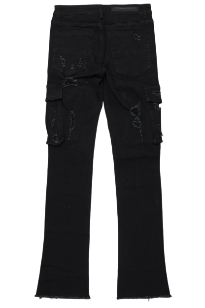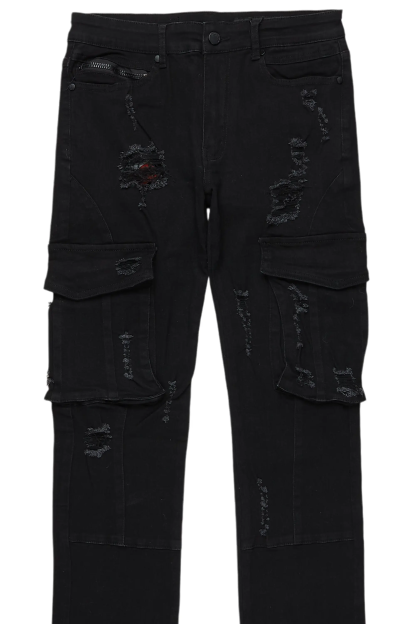 An urban stacked denim cargo jean for men in black. Designed with organic cotton and extra long legs for a must-cop streetwear staple piece.