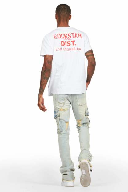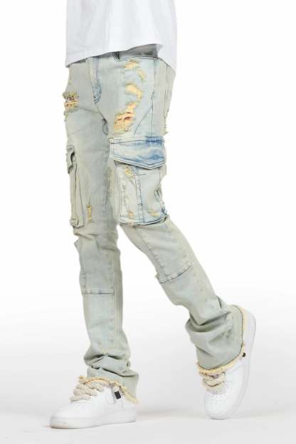 An urban stacked denim cargo jean for men in blue. Designed with organic cotton and extra long legs for a must-cop streetwear staple piece.