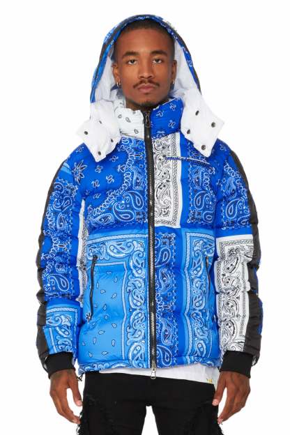 An urban streetwear puffer jacket for men in blue. Designed with highest-quality insulated fabric and water and wind-resistant materials for a must-cop outerwear style.