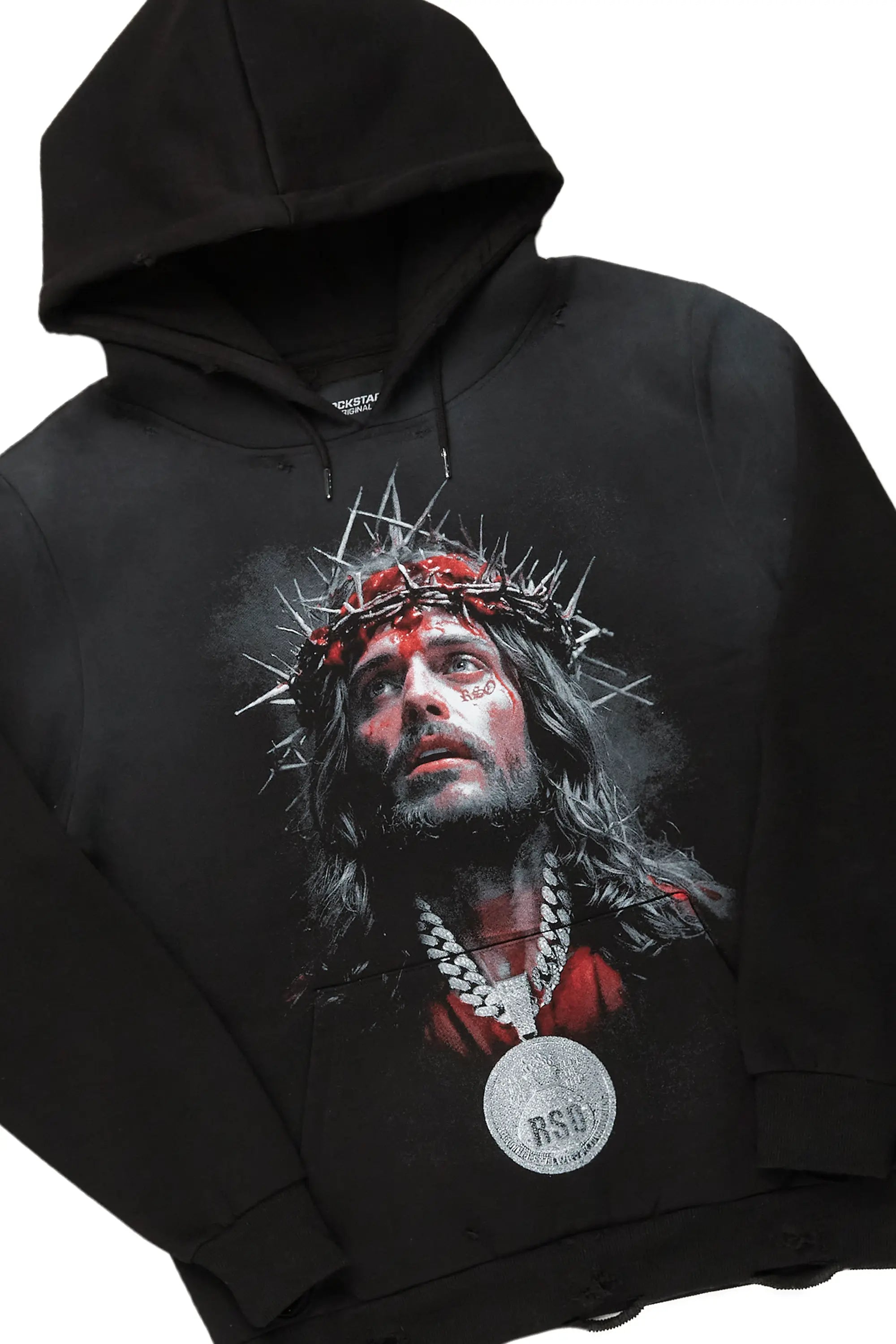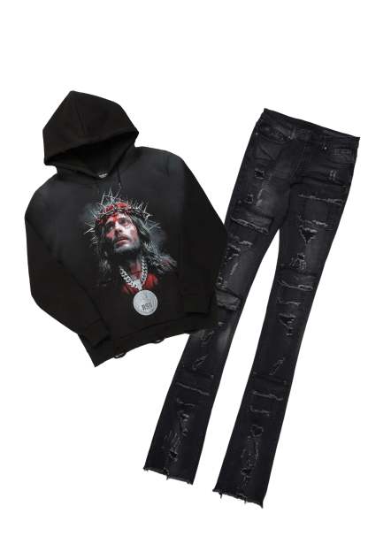 An urban two-piece graphic hoodie and super stacked jean set for men. Designed with organic cotton and extra long legs for a dope streetwear outfit set.