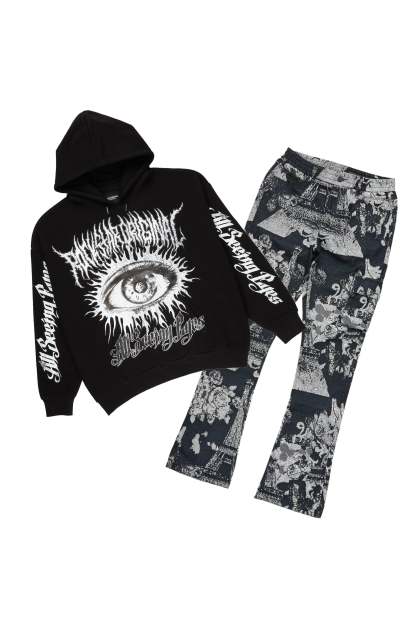 All Seeing Eyes Black Hoodie & Lamont Stacked Flare Tapestry Jean Bundle