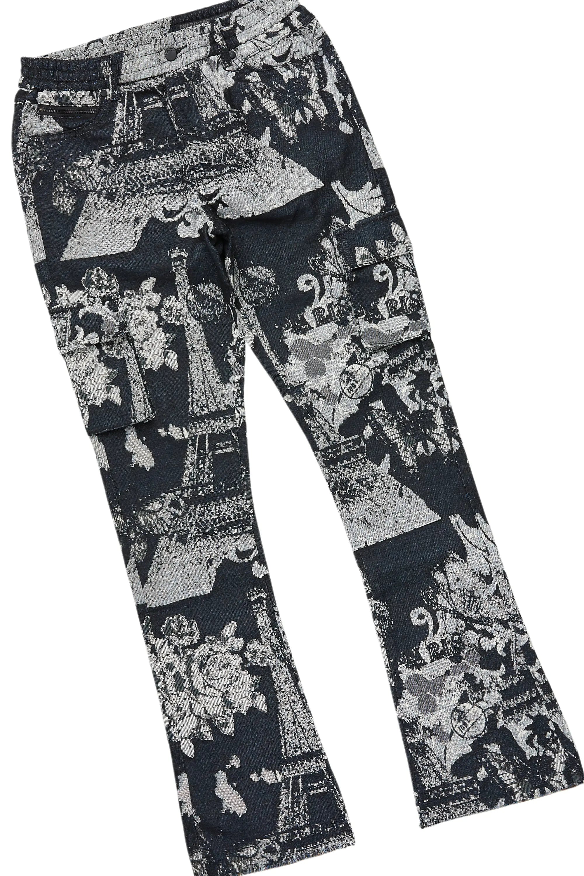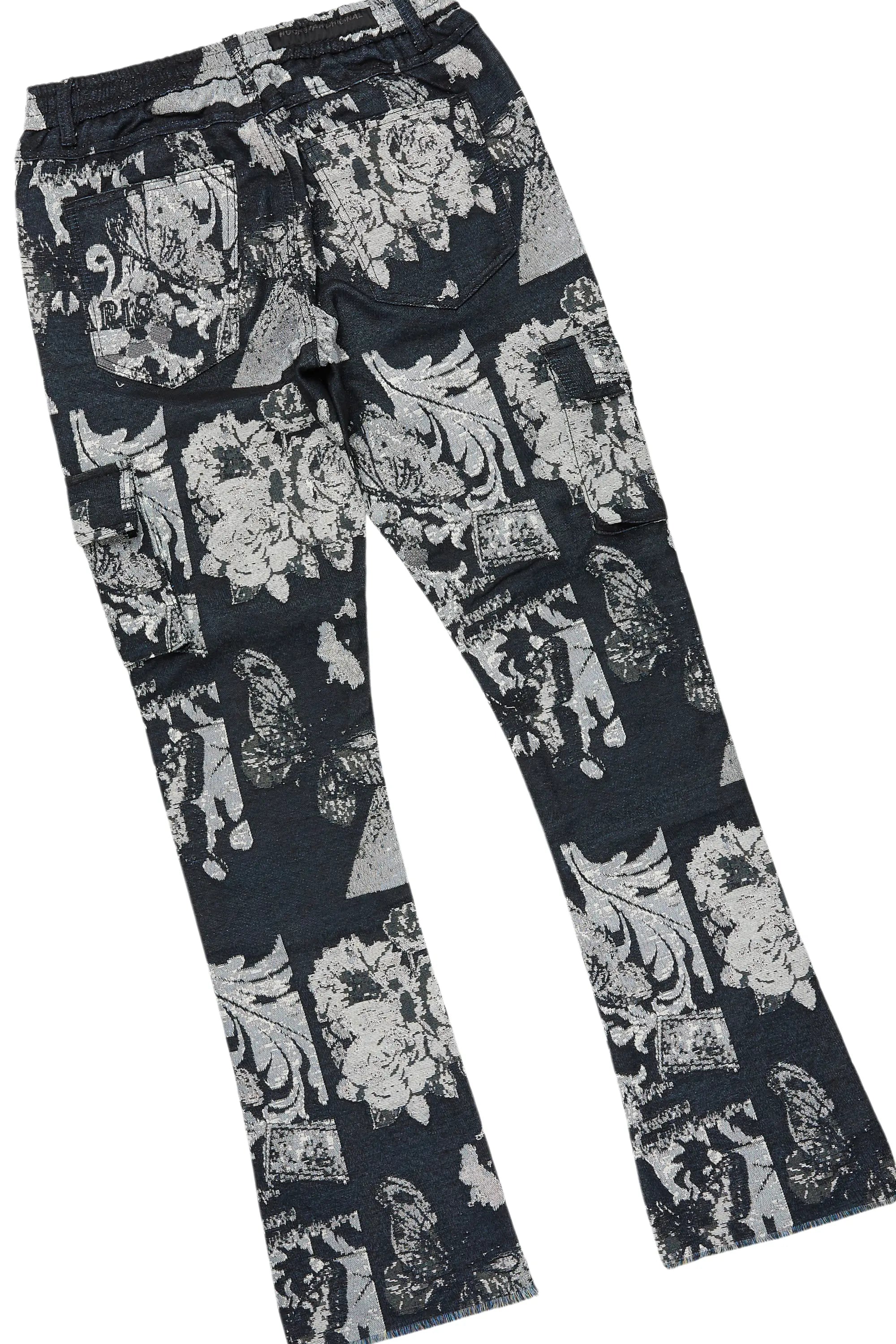 An urban two-piece hoodie and stacked cargo tapestry jean set for men. Designed with organic cotton and extra long legs for a dope streetwear outfit set.