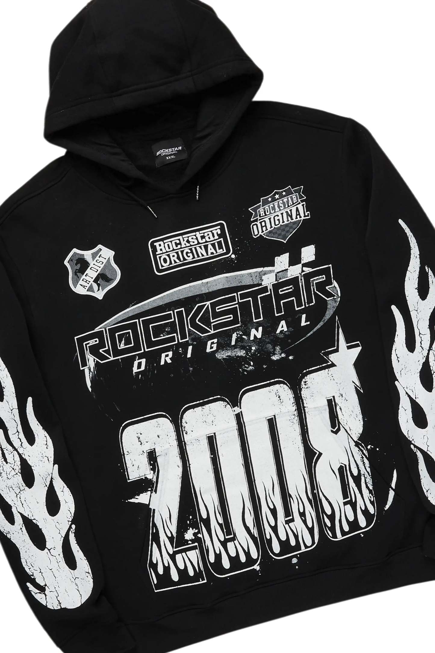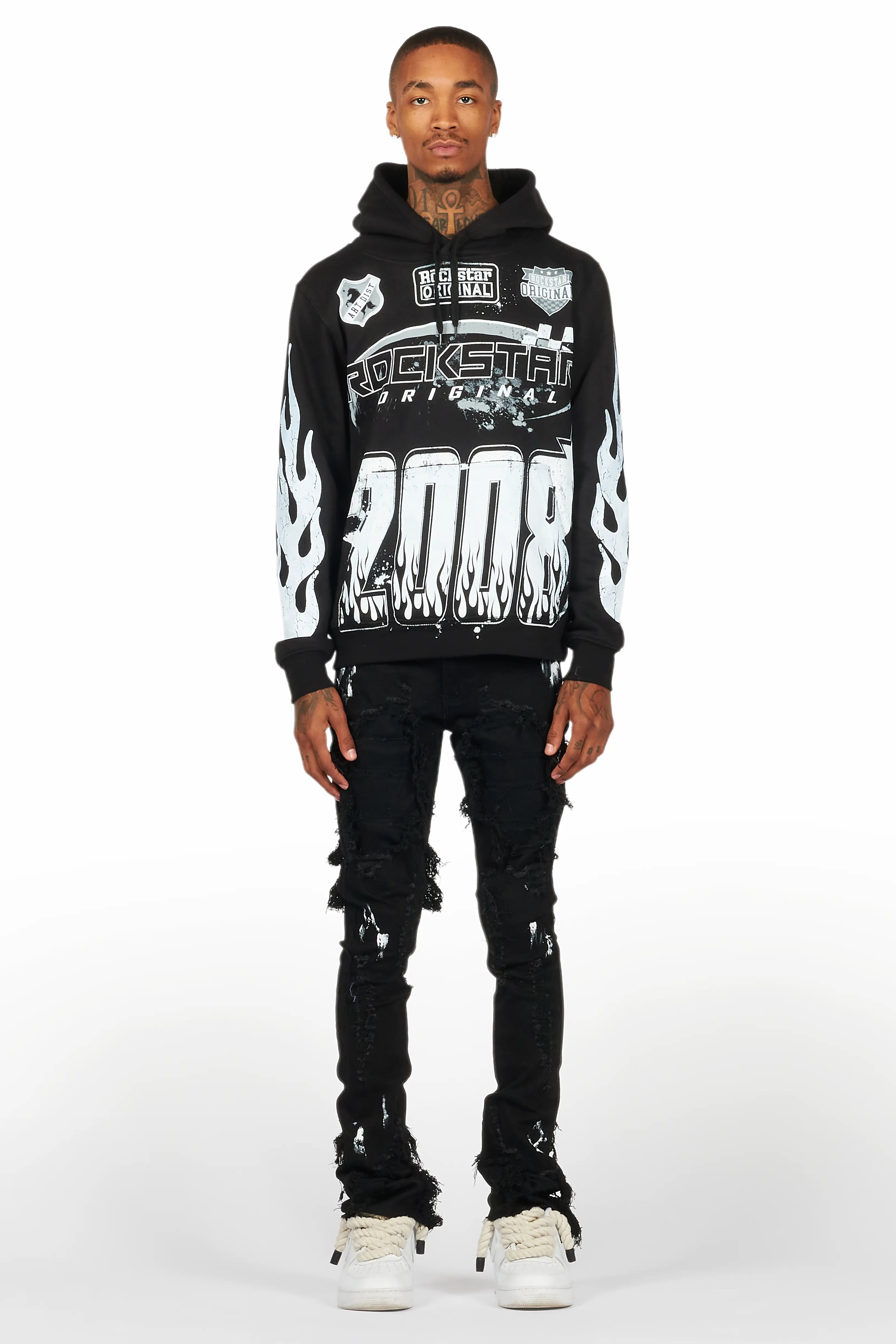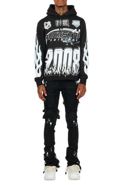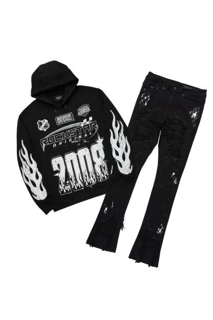 An urban two-piece graphic hoodie and stacked jean set for men. Designed with organic cotton and extra long legs for a dope streetwear outfit set.