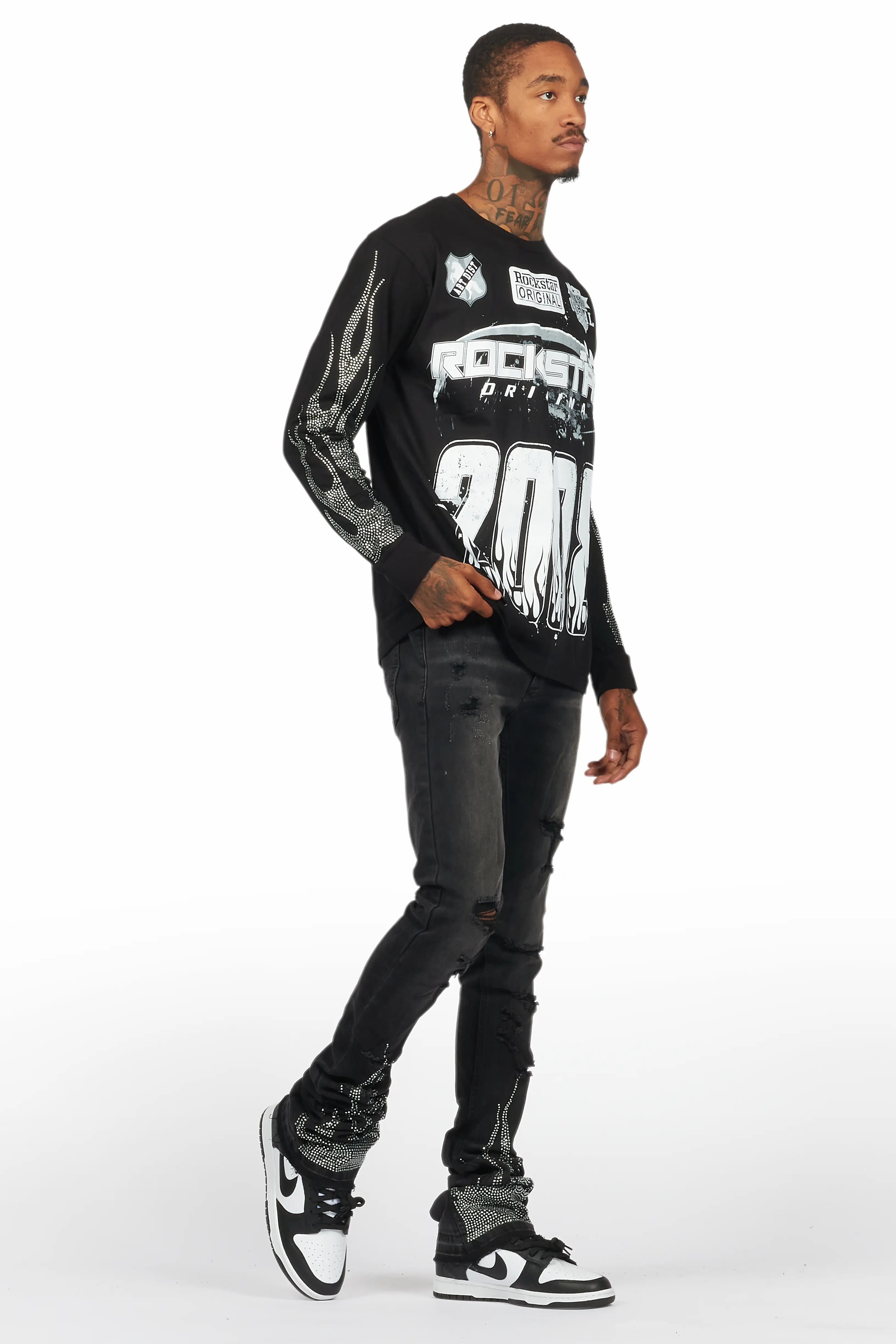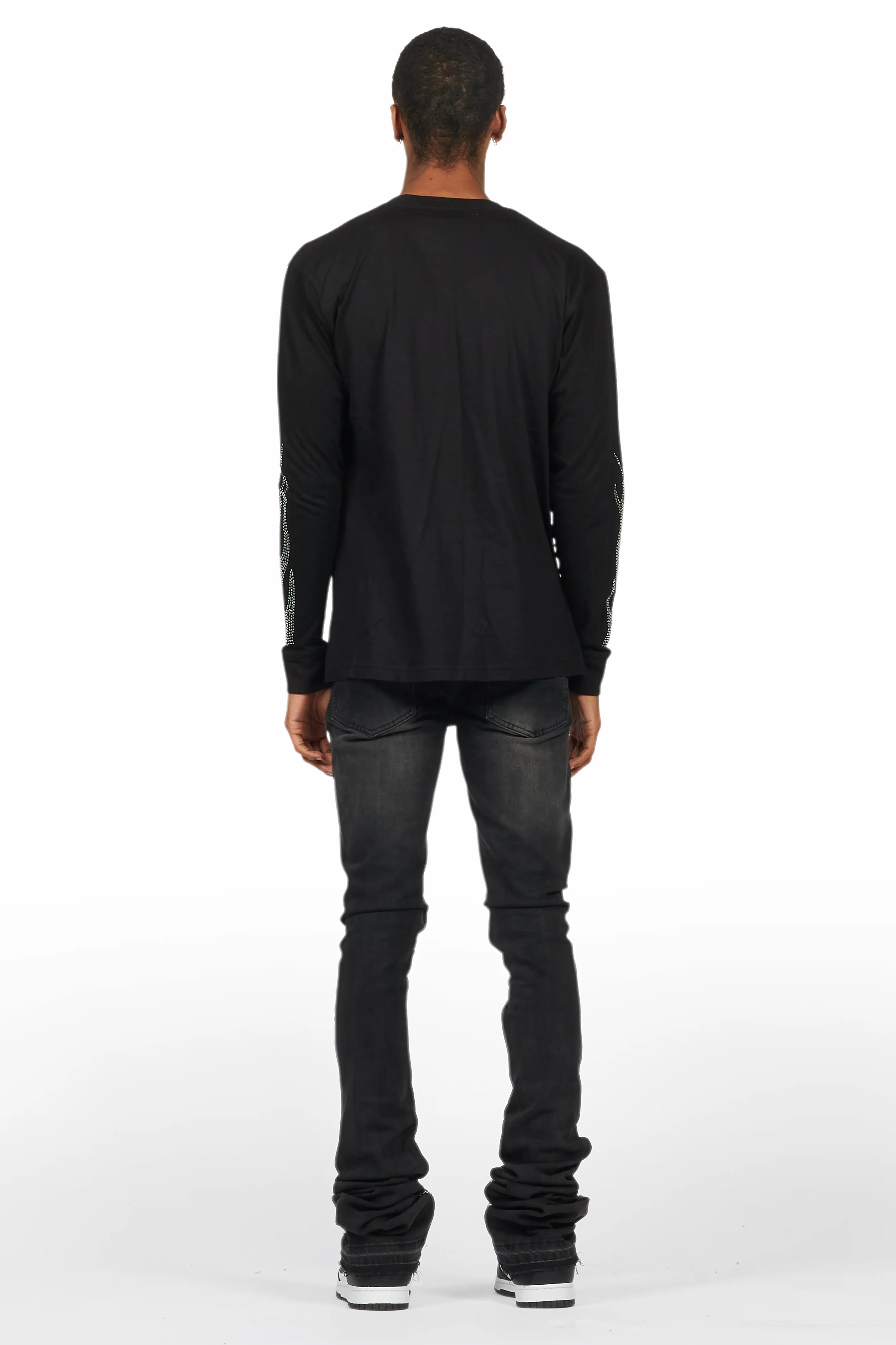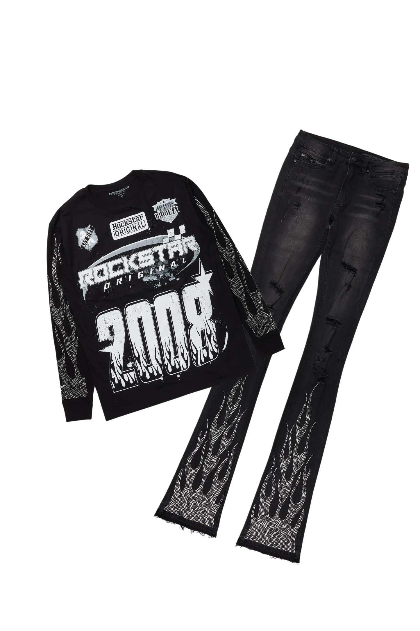 An urban two-piece long sleeve tee and super stacked jean set for men. Designed with organic cotton and extra long legs for a dope streetwear outfit set.