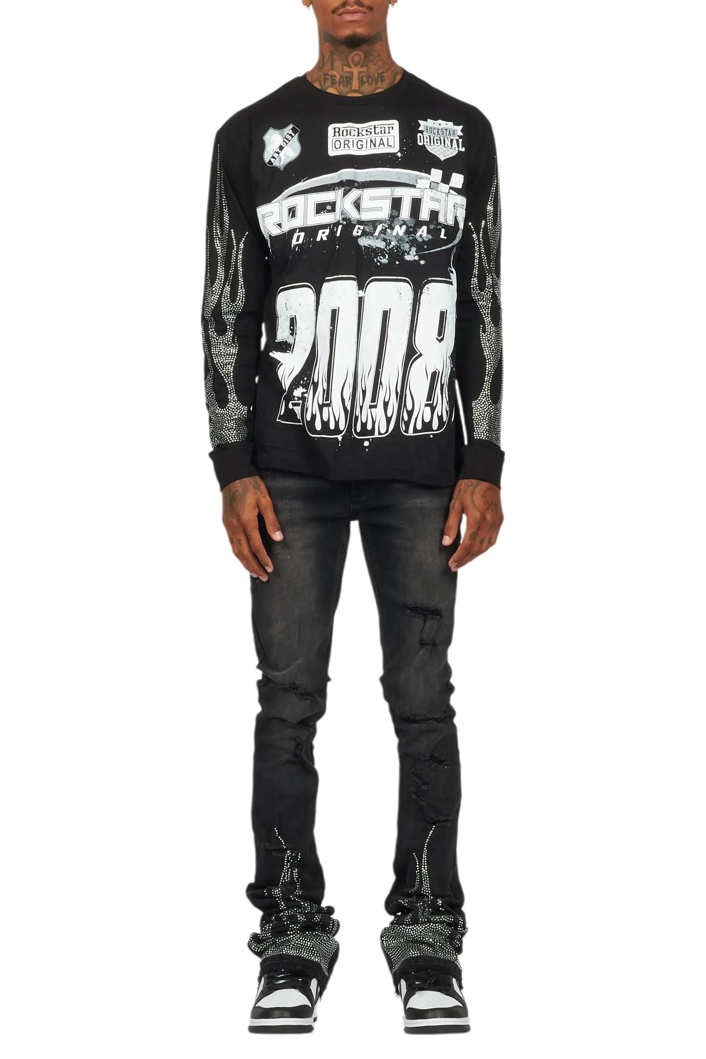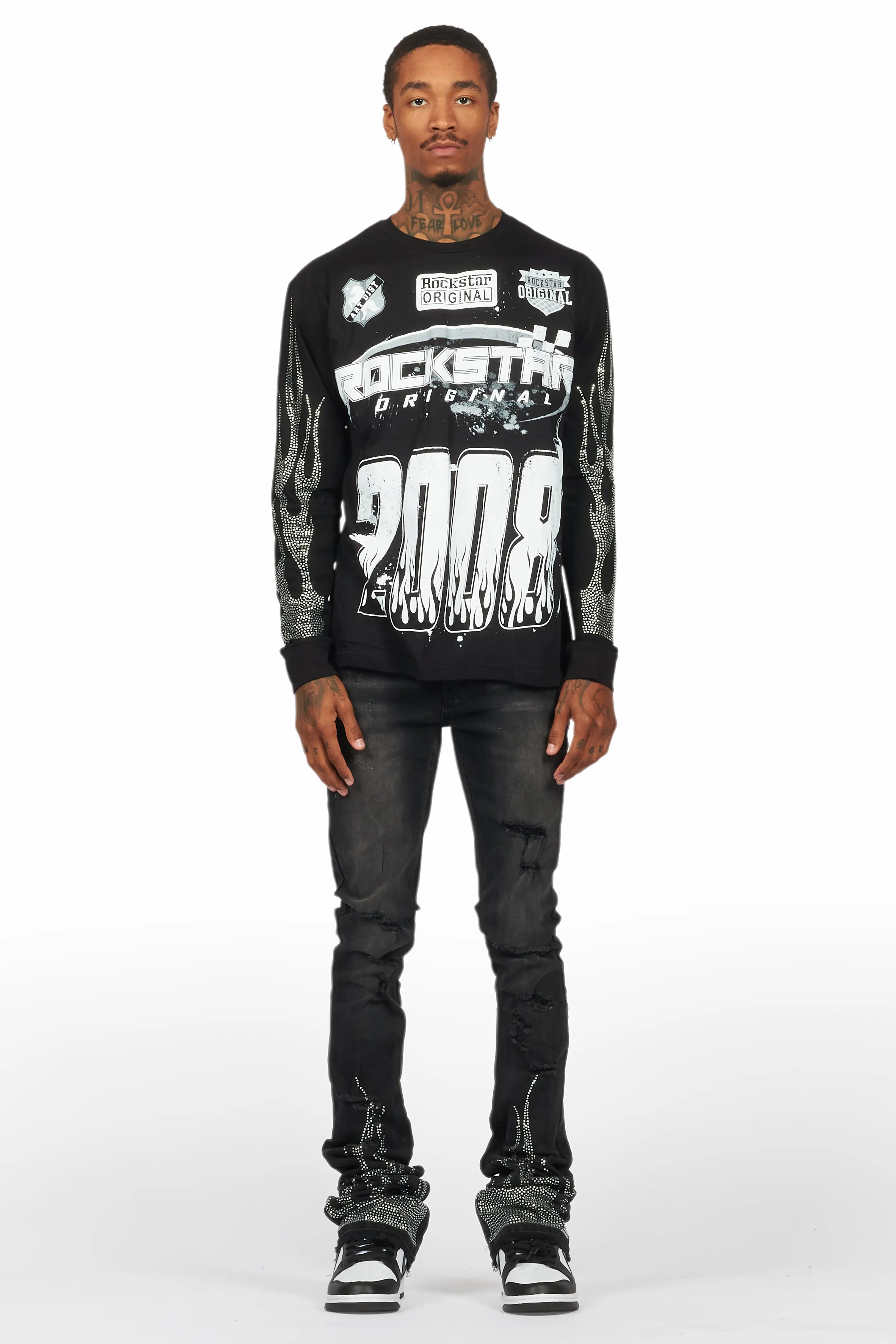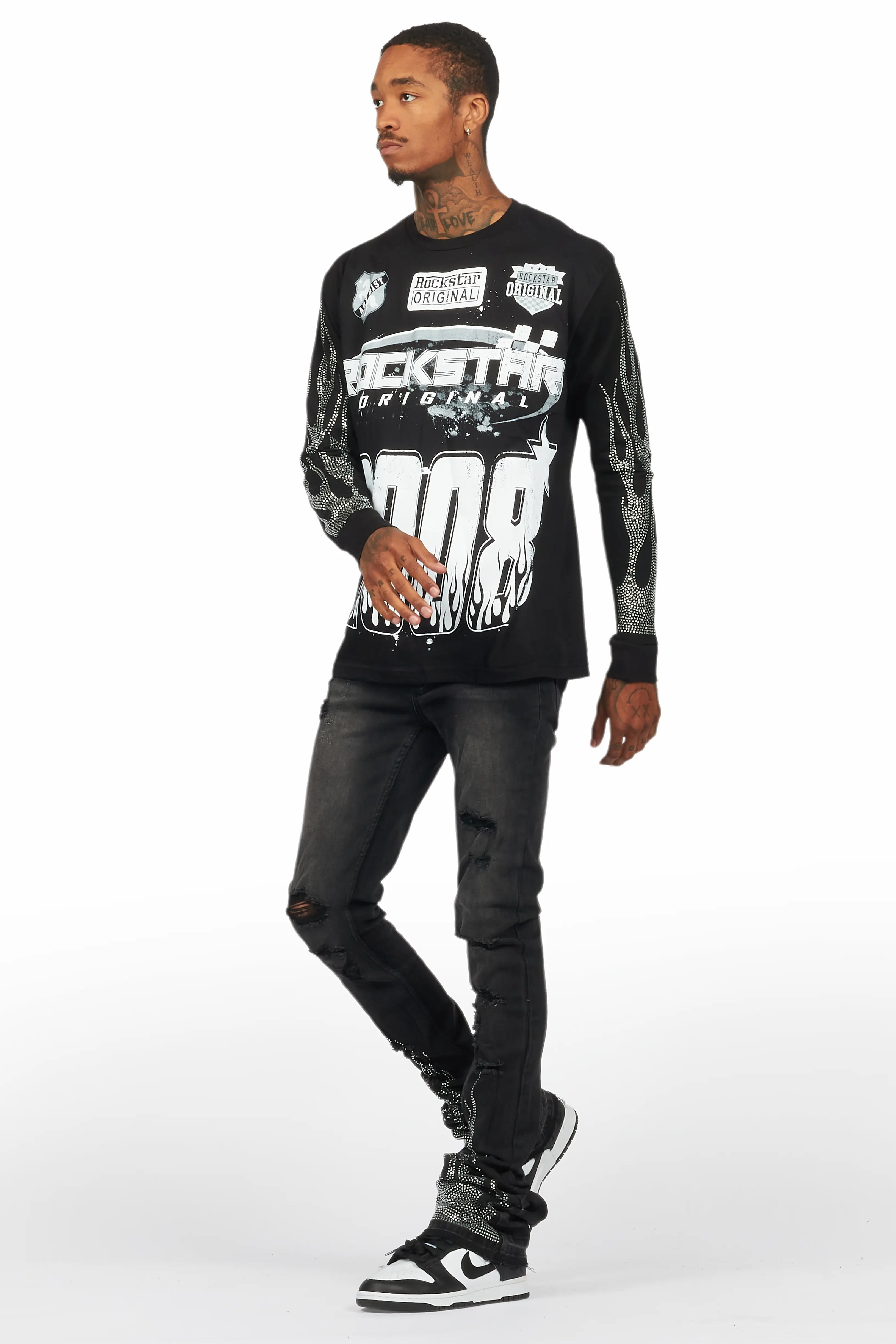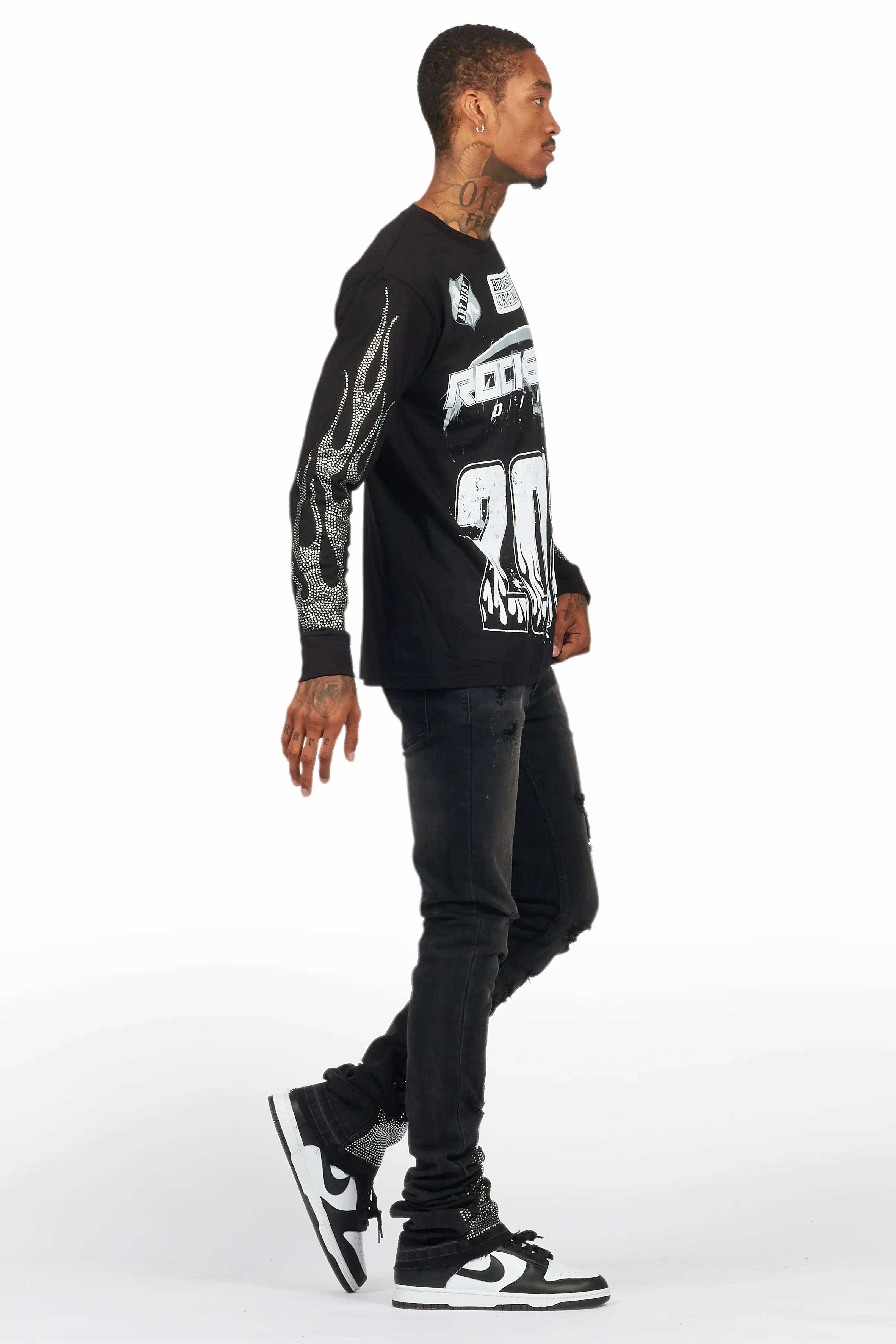 An urban two-piece long sleeve tee and super stacked jean set for men. Designed with organic cotton and extra long legs for a dope streetwear outfit set.
