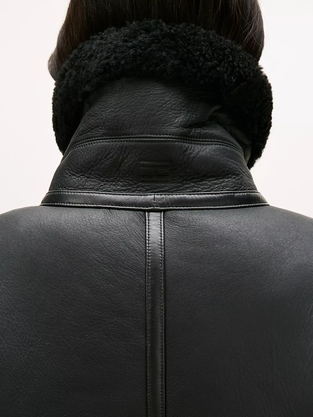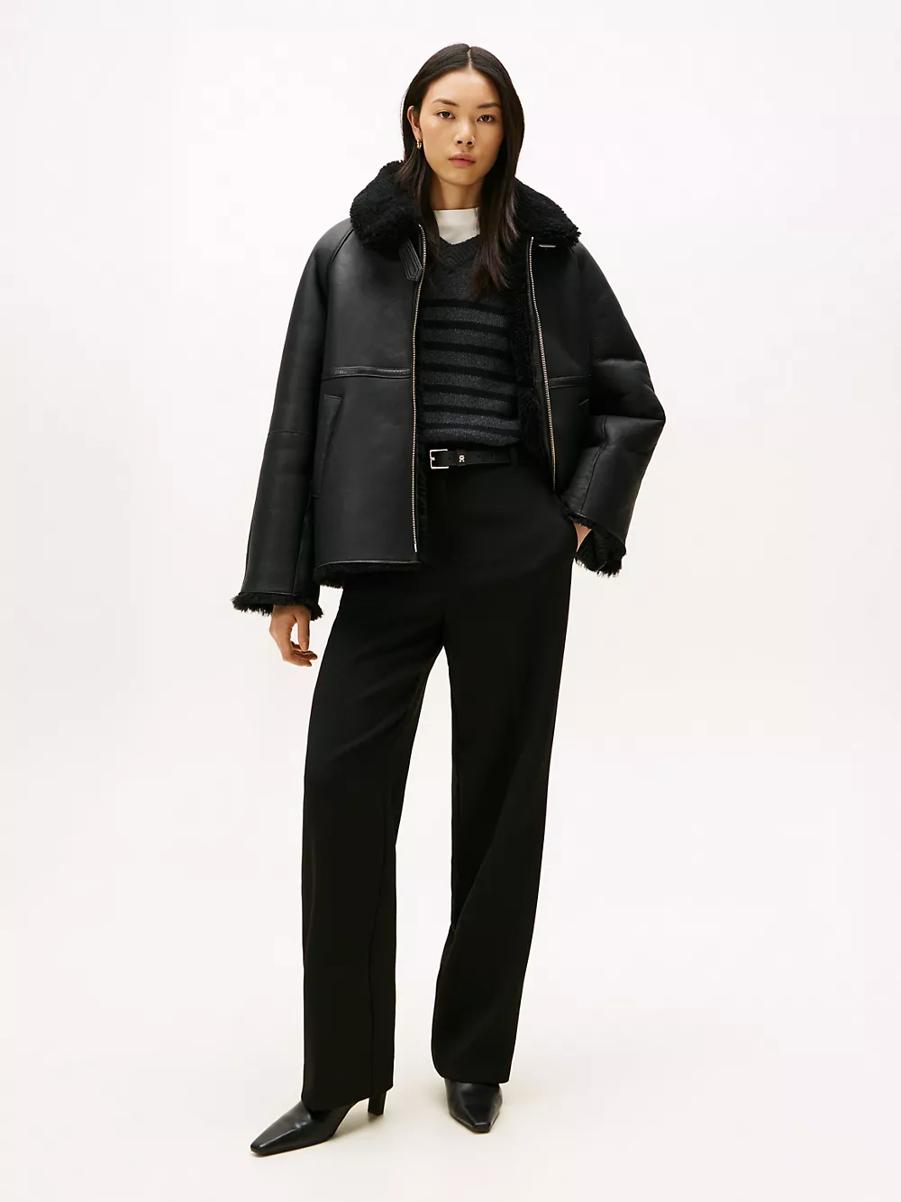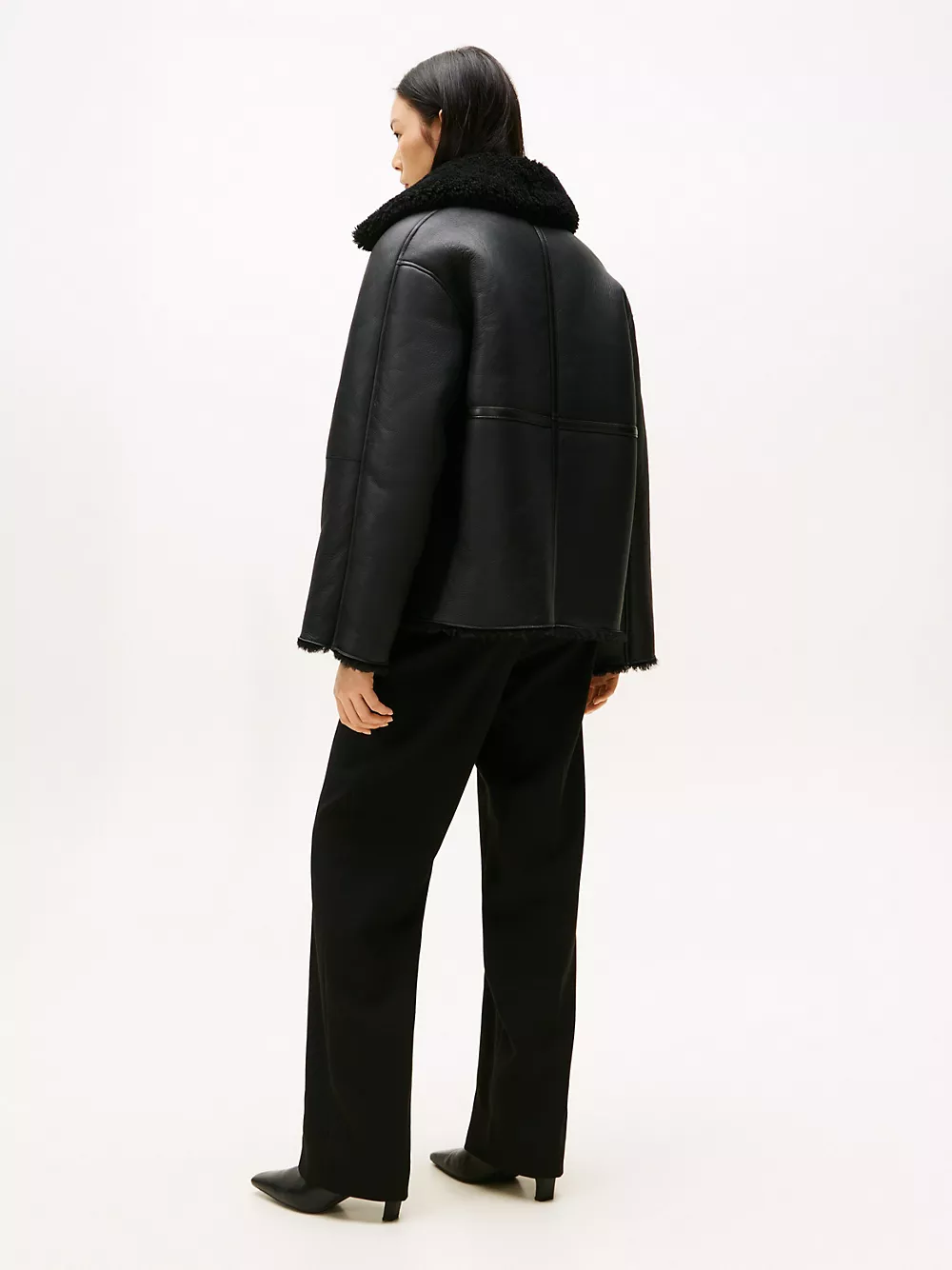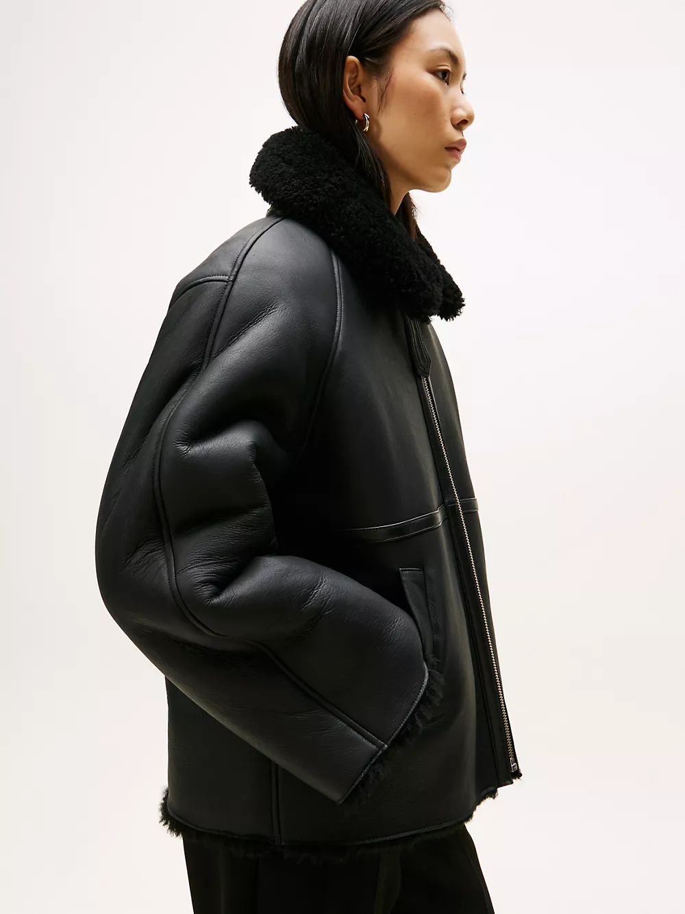 Tommy Hilfiger women's jacket. Experience luxe style, comfort and warmth with our take on the aviator jacket, made from supple leather with a plush shearling lining. This effortlessly cool piece is cut with an oversized fit that slips easily over winter layers.