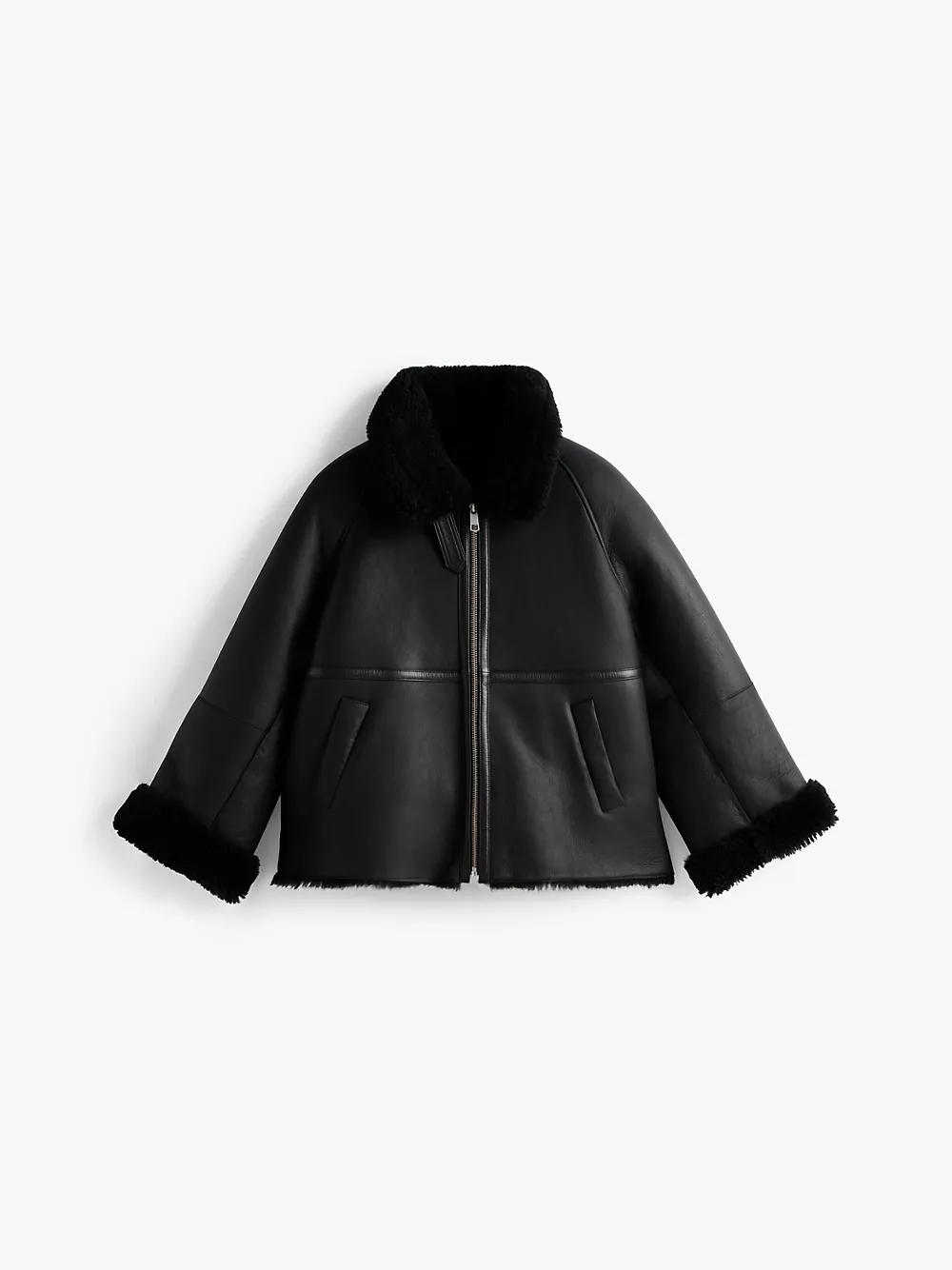 - Buckle strap at collar, zip closure, welt pockets, shearling collar and lining.