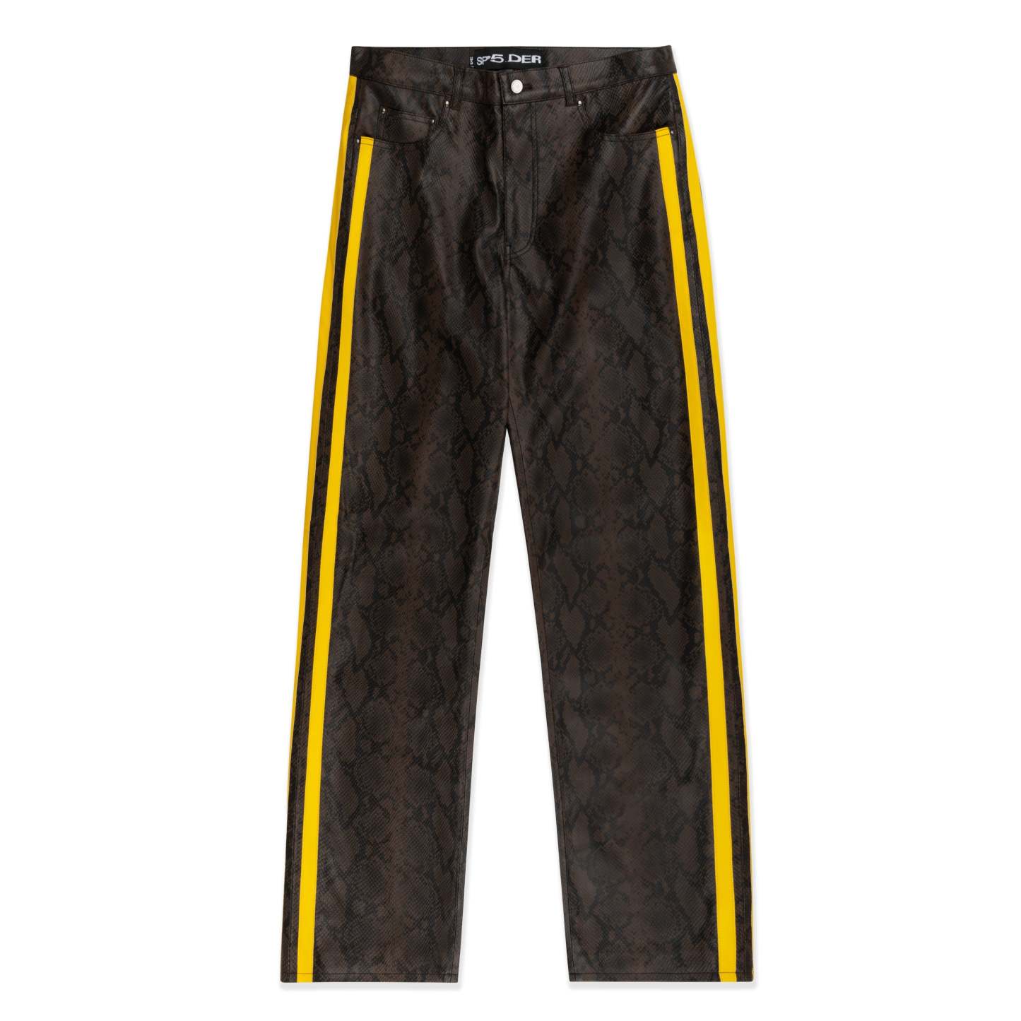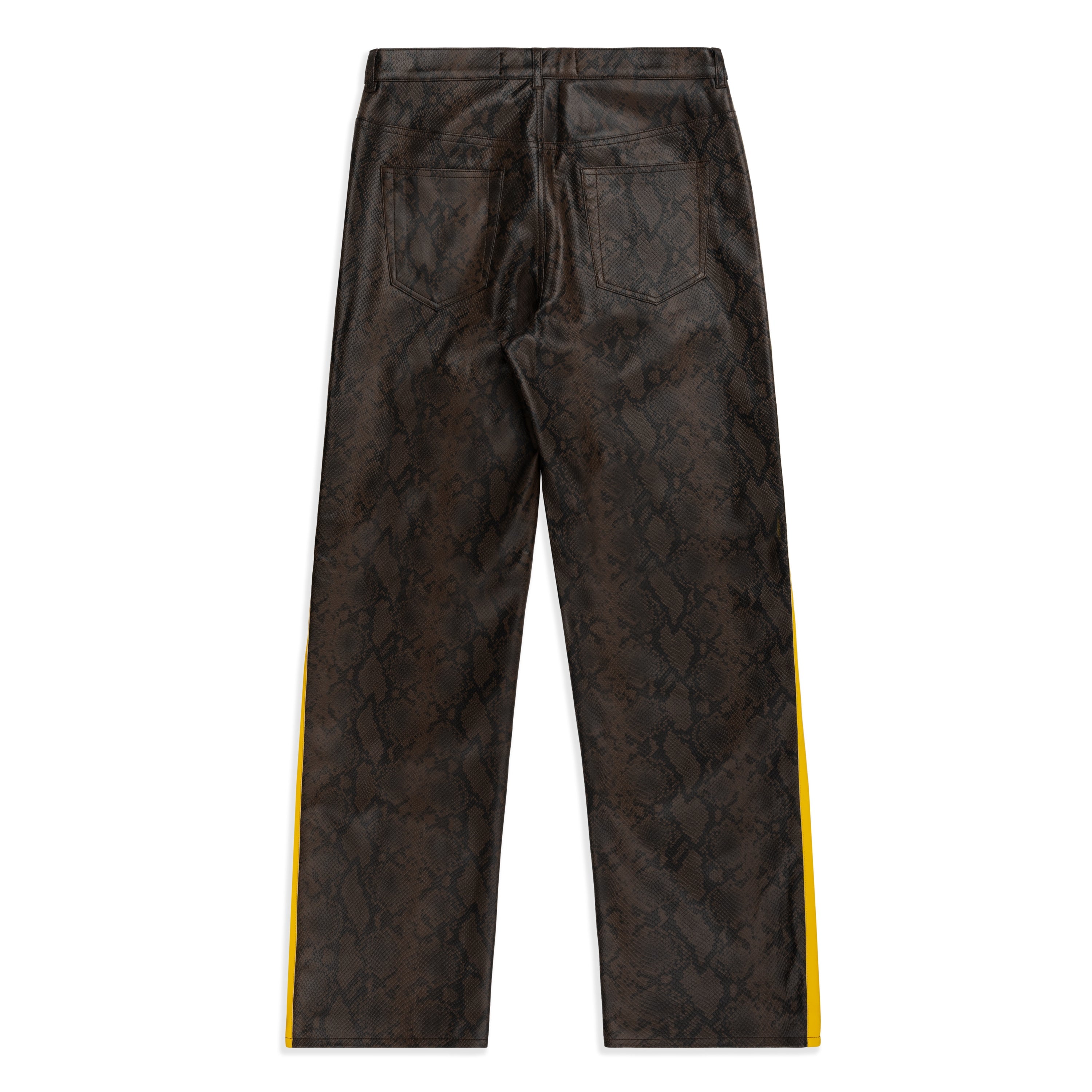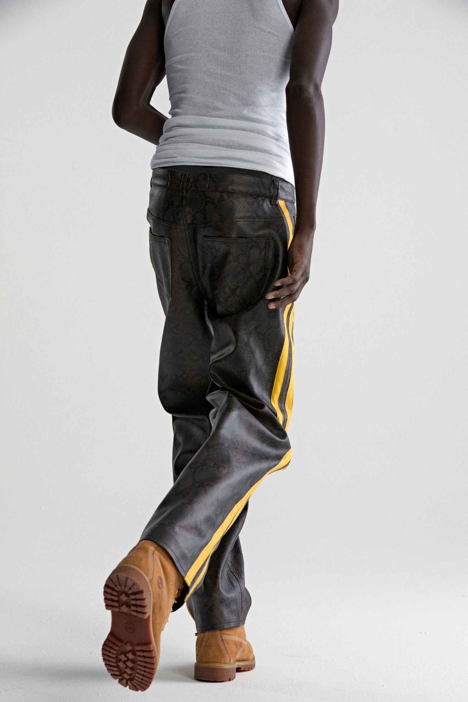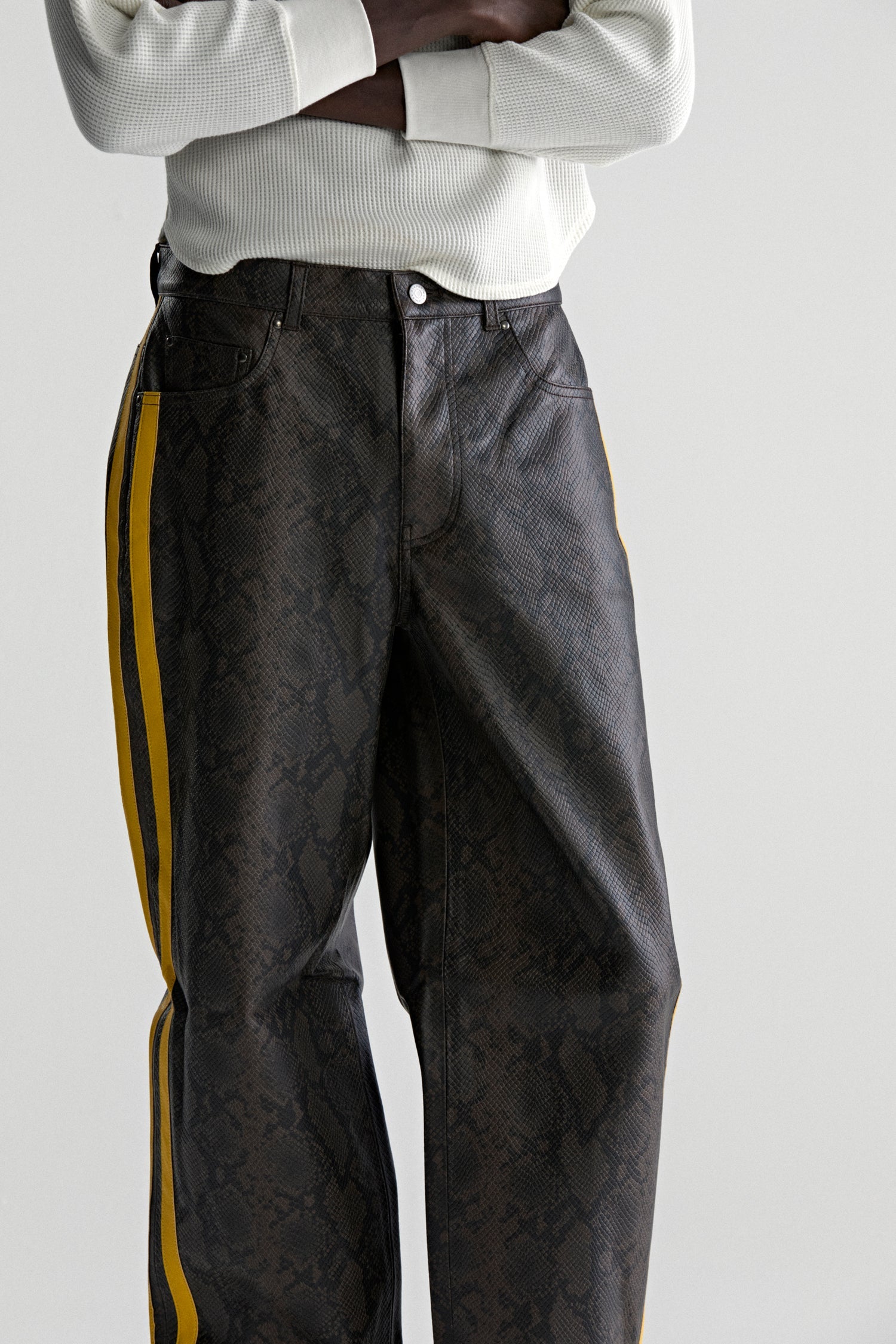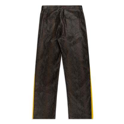 100% Cowskin leather. Snakeskin design. Contrast side stripes. Four pocket styling, button fly, and belt loops detailing.