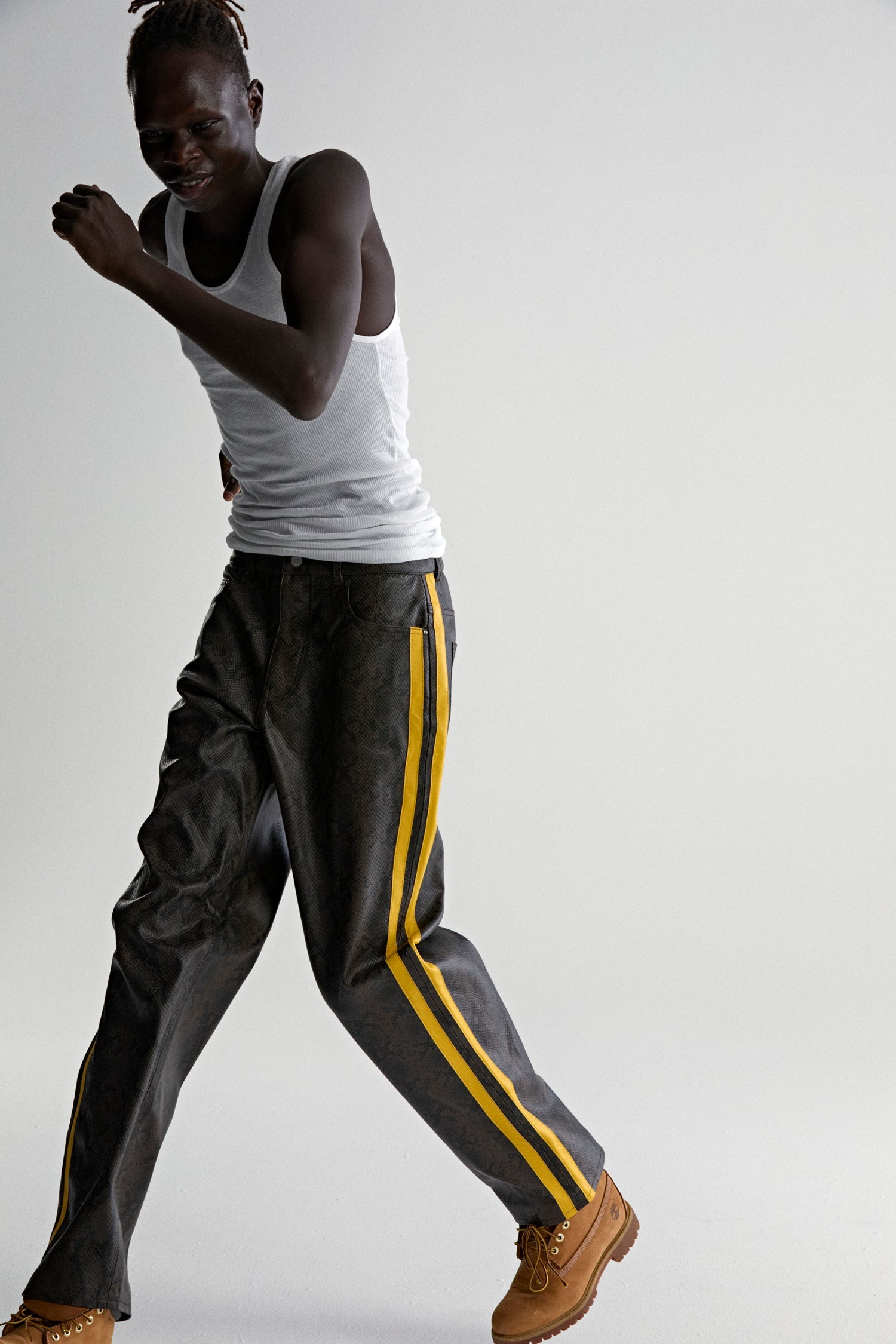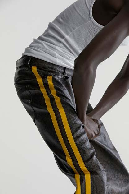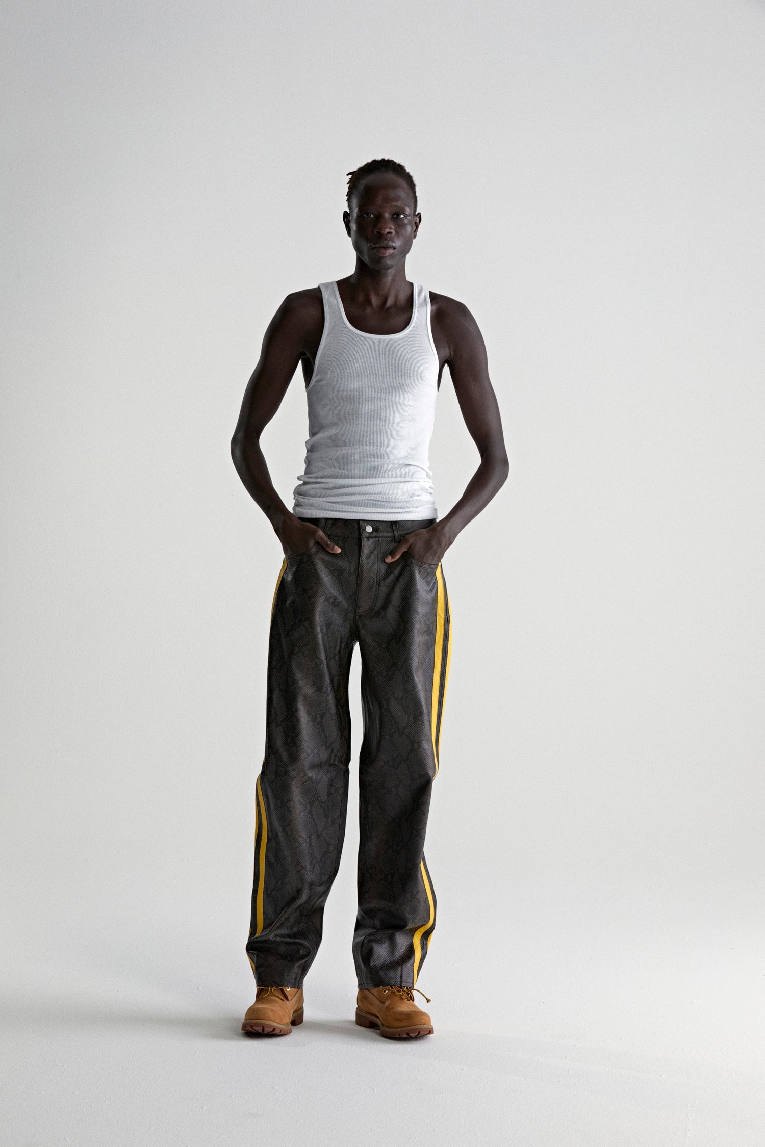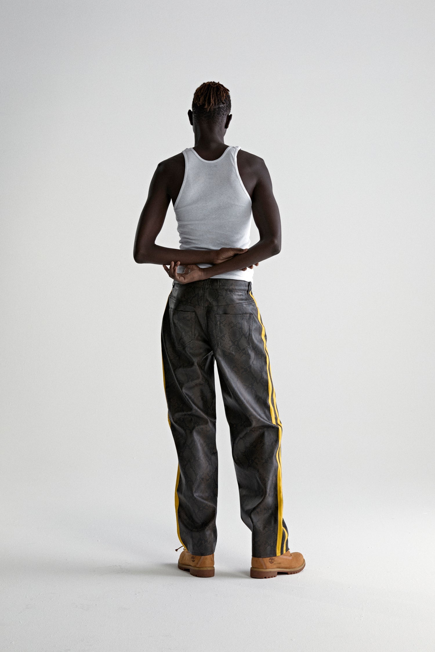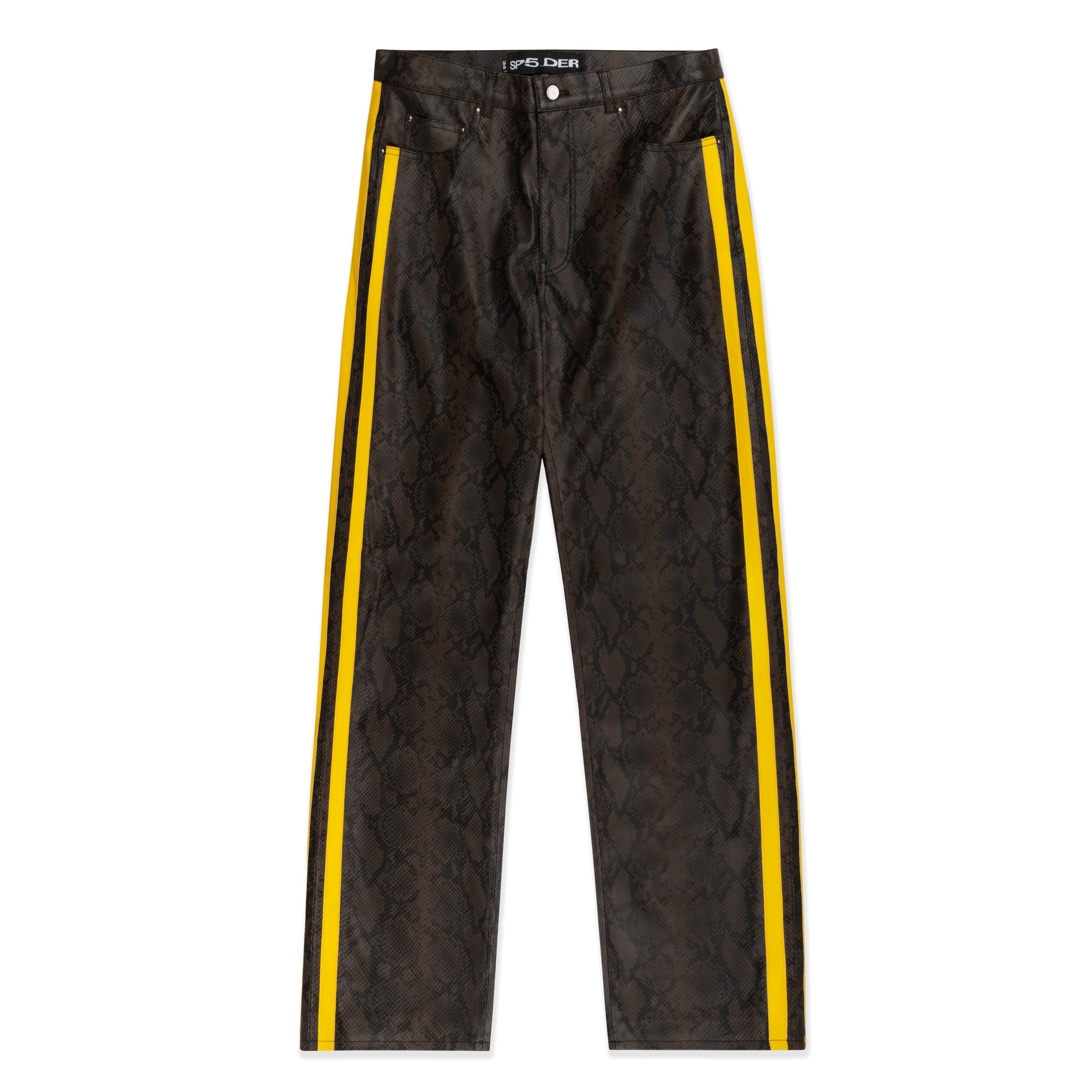 100% Cowskin leather. Snakeskin design. Contrast side stripes. Four pocket styling, button fly, and belt loops detailing.