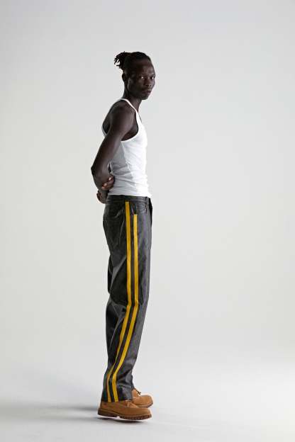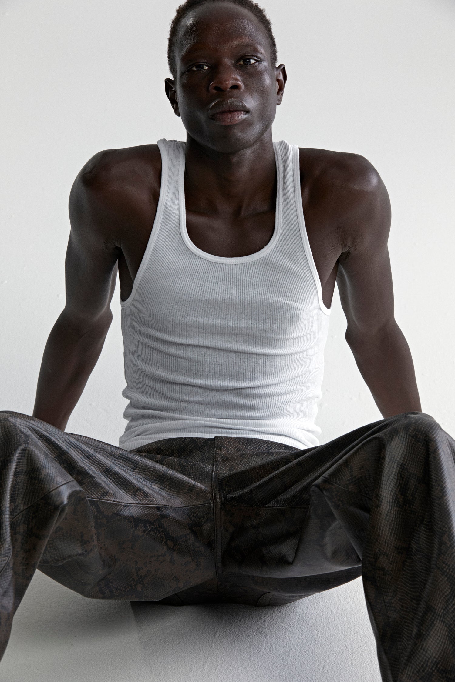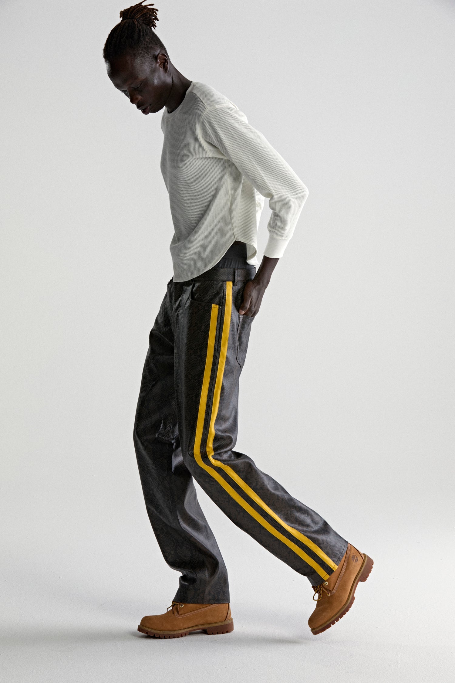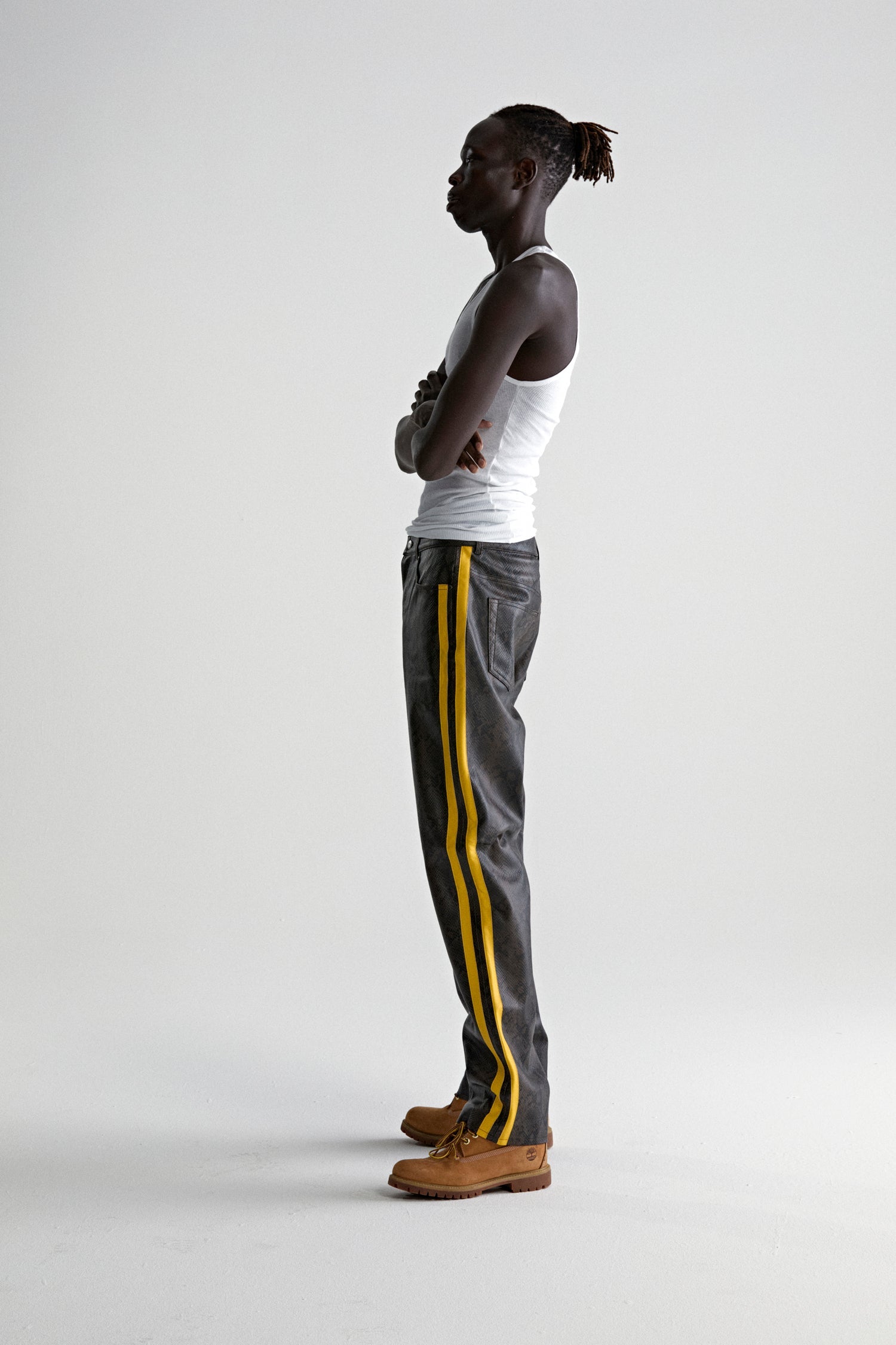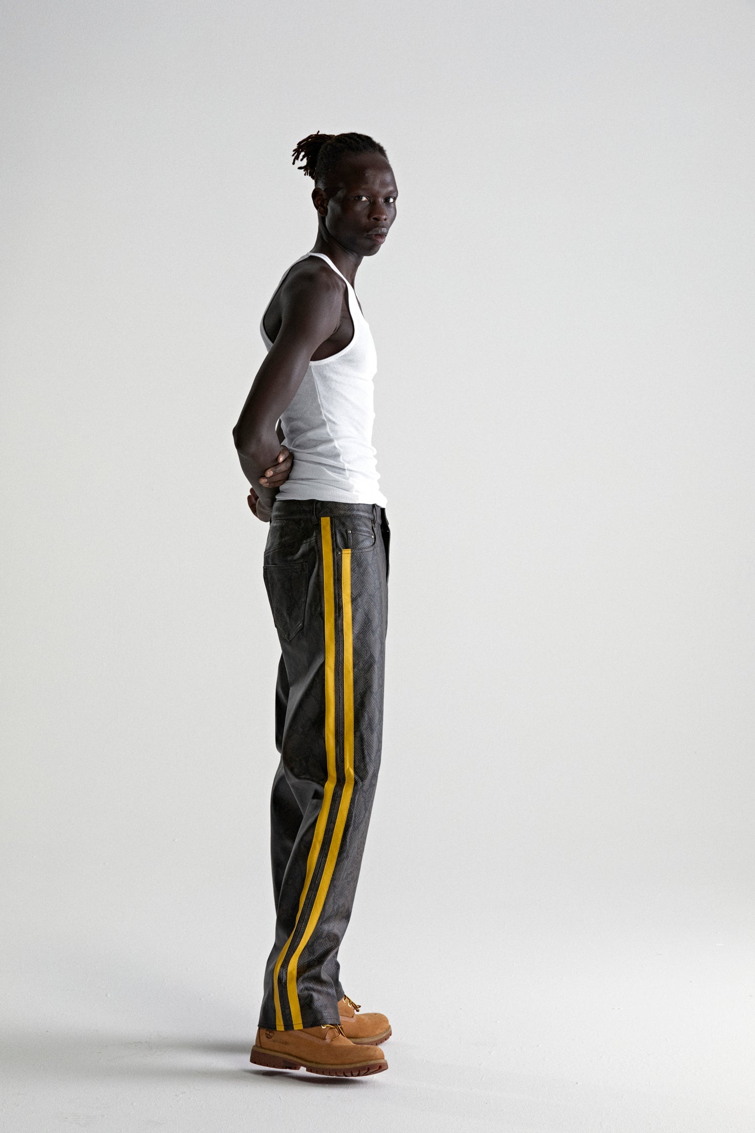 100% Cowskin leather. Snakeskin design. Contrast side stripes. Four pocket styling, button fly, and belt loops detailing.