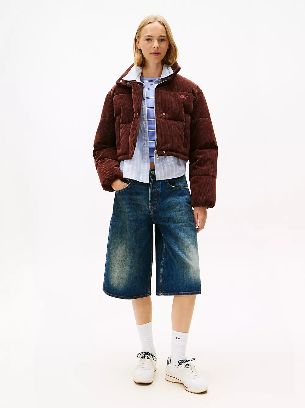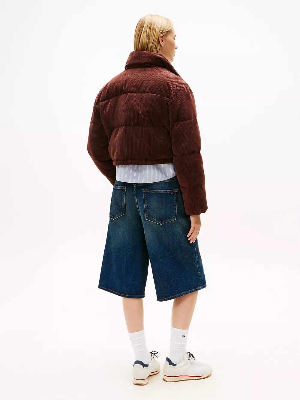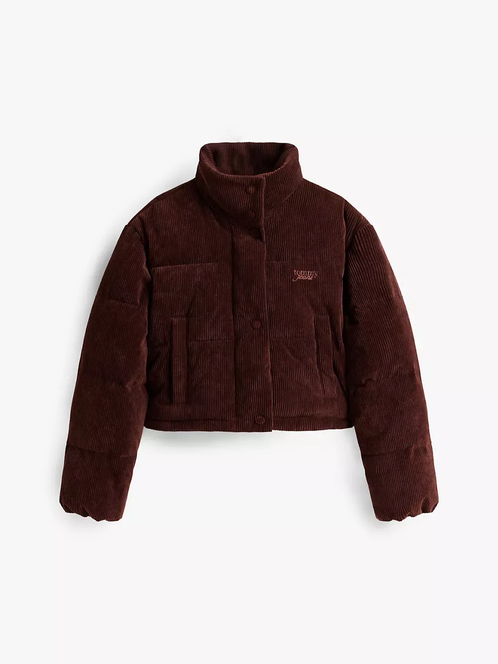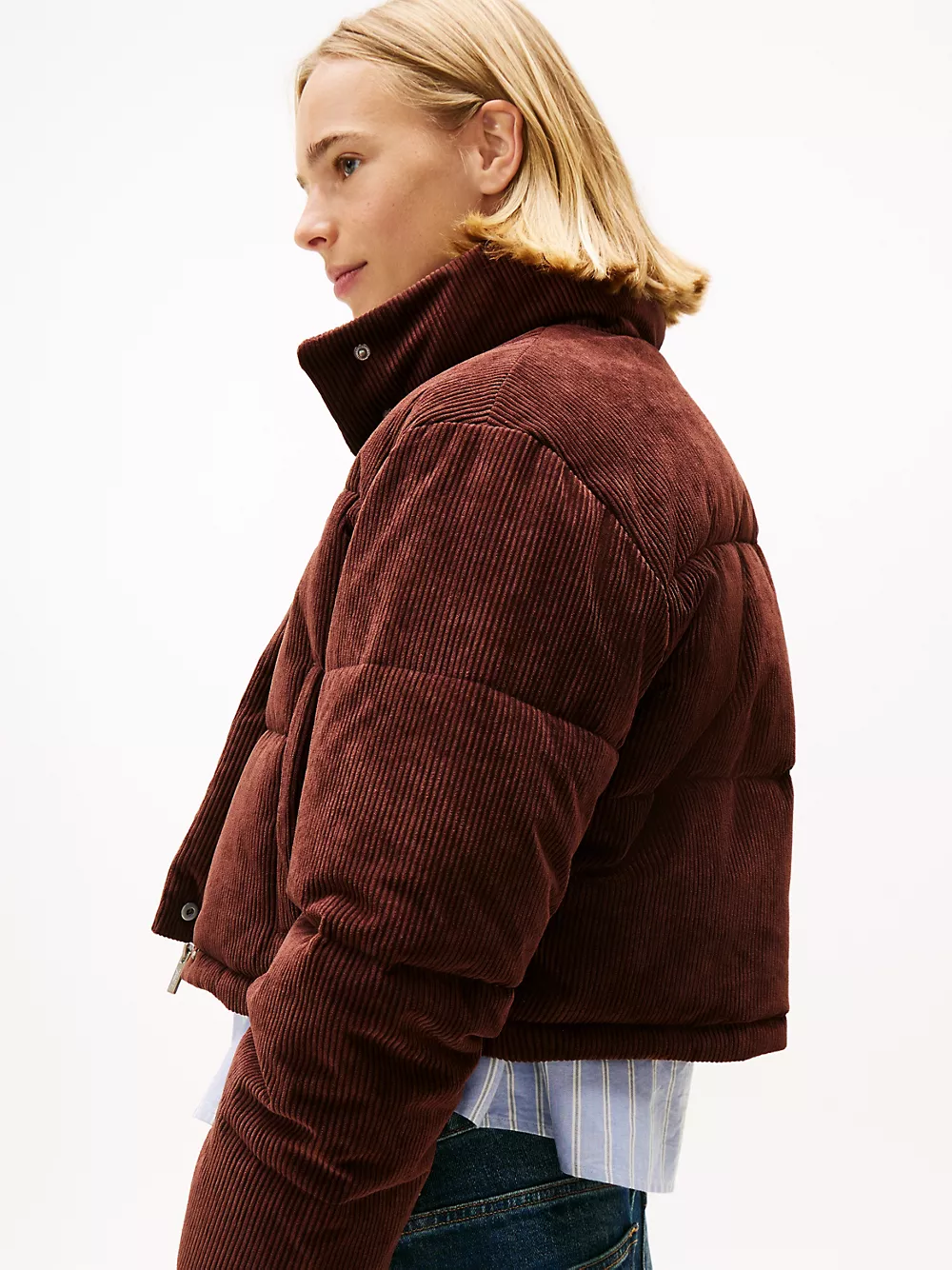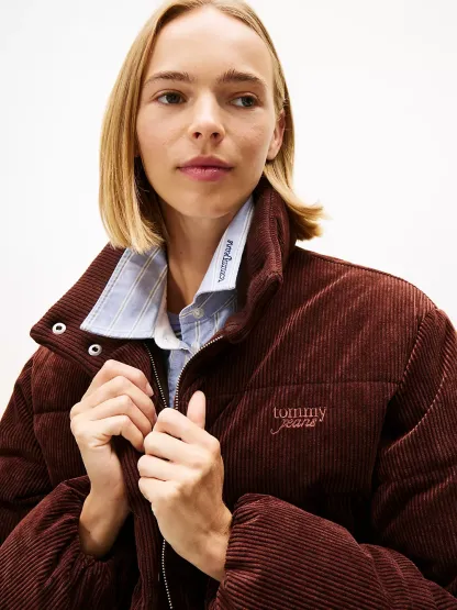 Tommy Hilfiger women's jacket. This puffer jacket brings tactile interest to your outerwear collection with its soft corduroy finish and pillowy, padded design. Part of our Tommy Jeans collection.