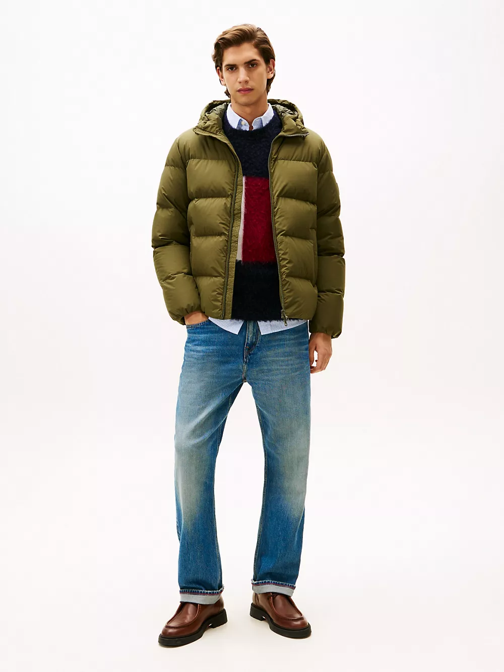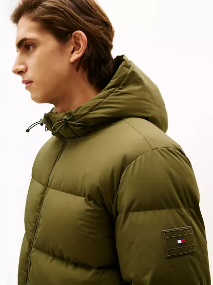 Tommy Hilfiger men's jacket. Designed to brave the elements, this hooded puffer jacket features a smooth, water-repellent shell and warm down insulation.