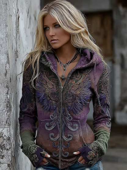 Women's Viking Mythology Phoenix Embroidery Comfortable Warm Zipper Hoodie