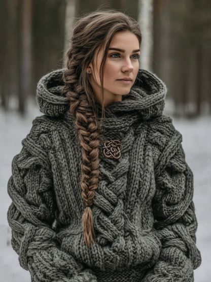 Women's Vintage Celtic Knot Art Knit Aran Hooded Sweater