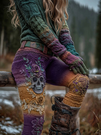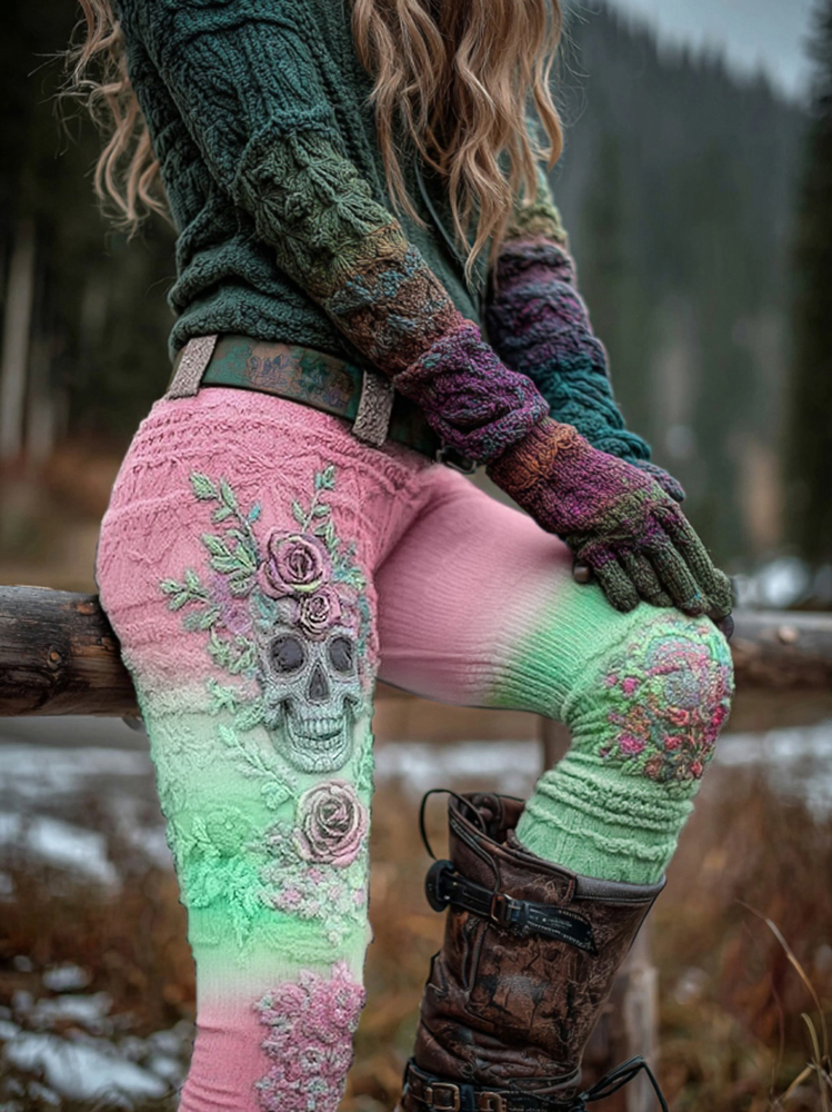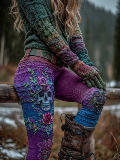 Women's Vintage Viking Skull And Rose Gradient Art Knit Leggings