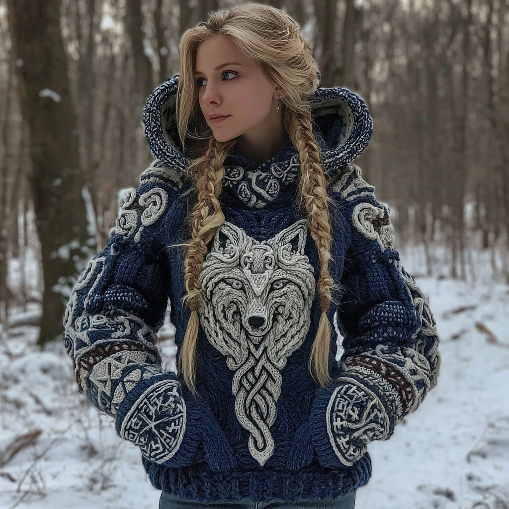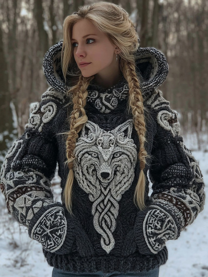Women's Vintage Viking Wolf Art Knit Hooded Sweater