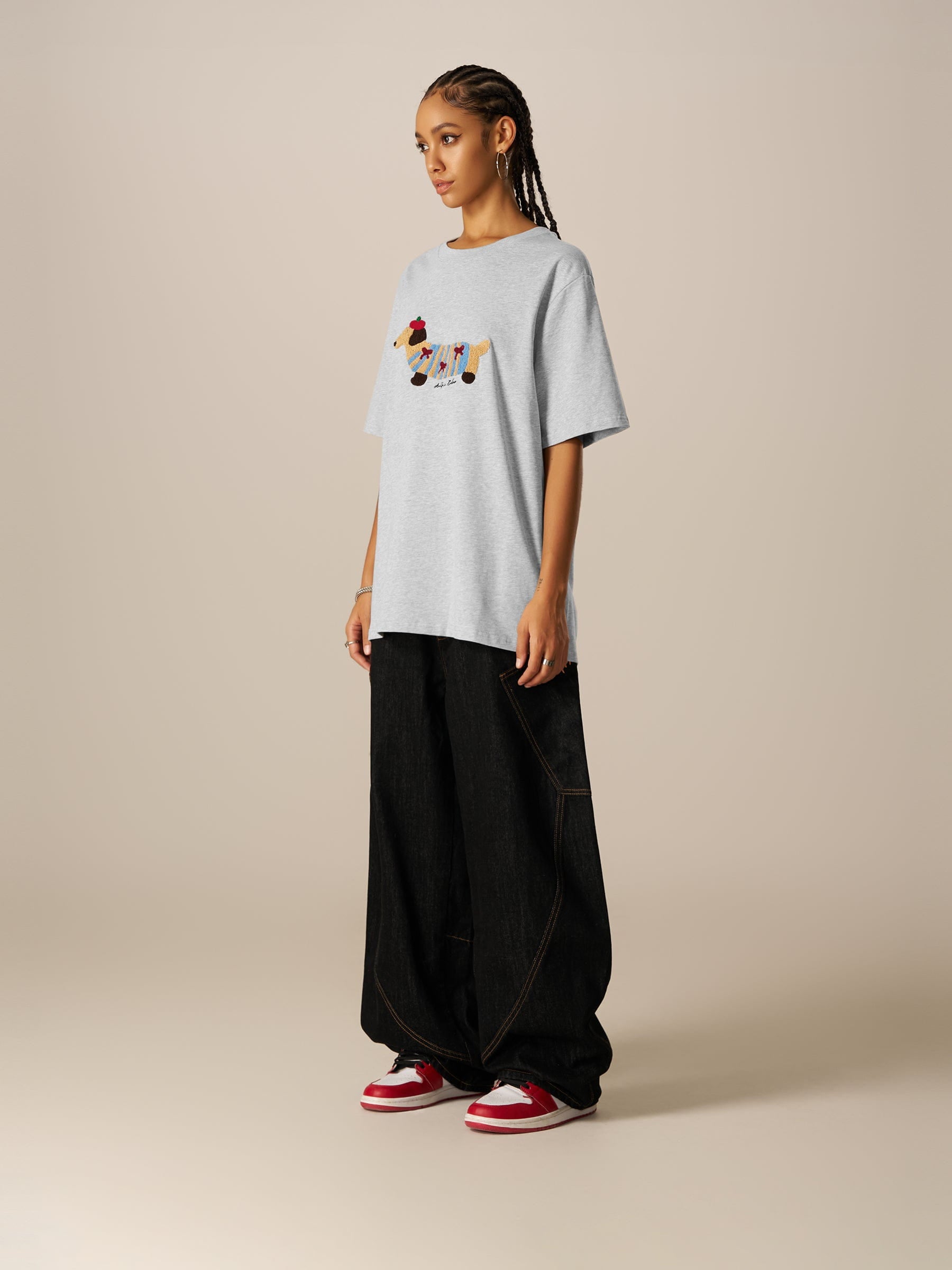 Aelfric Eden Cartoon Dog Tee showcases a dog embroidery that adds a noticeable sense of dimension, enhancing the overall texture of the tee, and embodies a cute, casual style.