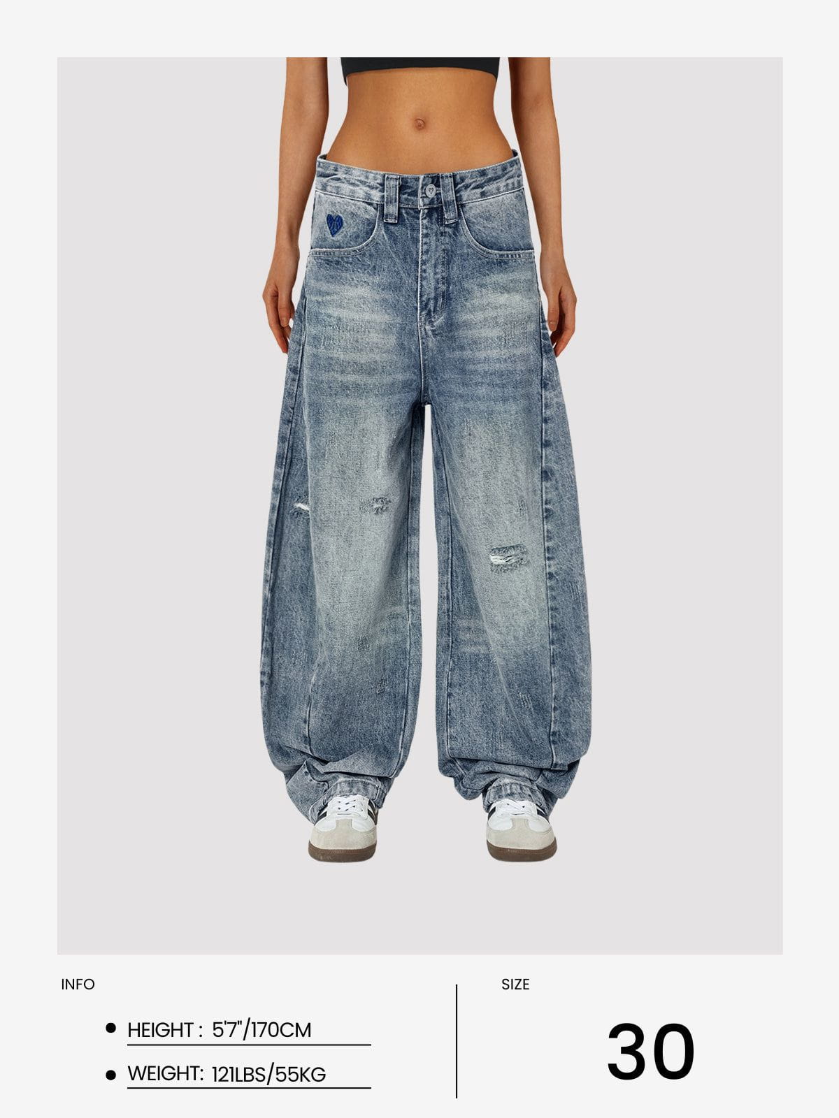 Crafted with curved-cut and distressed details, these vintage-washed jeans blend comfort and attitude. The baaggy fit and ripped finish create the perfect laid-back street look.